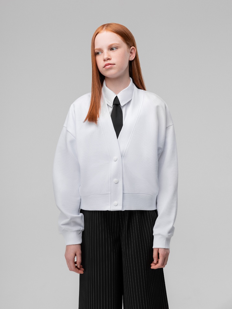 Материал футер двухнитка Состав 80% хлопок 20% полиэстер Укороченный свободный жакет из материала пике на кнопке. Жакет со спущенным плечом, без карманов. На спинке брендированный принт герба.