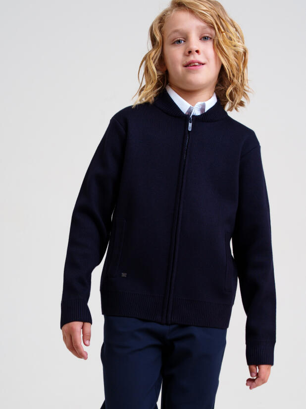 Классический темно-синий школьный вязаный бомбер для мальчика подростка от PlayToday — современный и стильный выбор для школы и повседневных образов. Прямой силуэт, застёжка на молнии и лаконичный дизайн делают эту кофту базовым элементом гардероба для активных и уверенных в себе школьников.