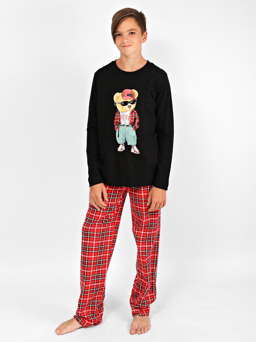 Пижама для детей c 8 до 12 лет. Состоит из однотонного лонгслива с принтом и штанишек в клетку прямого кроя на резинке. Выполнена из натурального, гипоаллергенного материала - кулирка. Подойдёт как домашняя одежда.