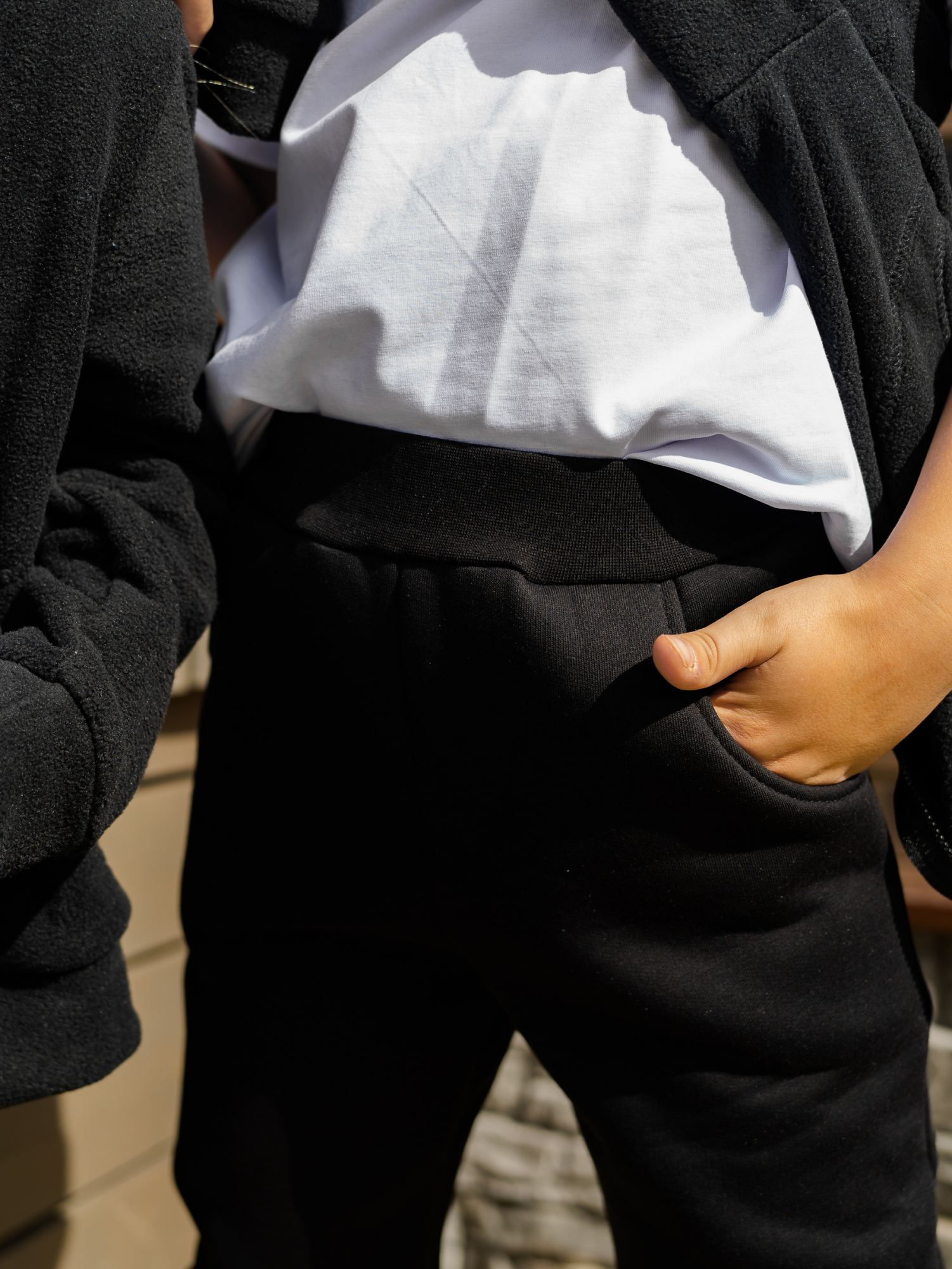 Зауженные утепленные модные брюки из футера с начесом черного цвета . С боковыми карманами и манжетами снизу. Изделие выполнено из трикотажа премиального качества - ПЕНЬЕ, с содержанием хлопка более 80%