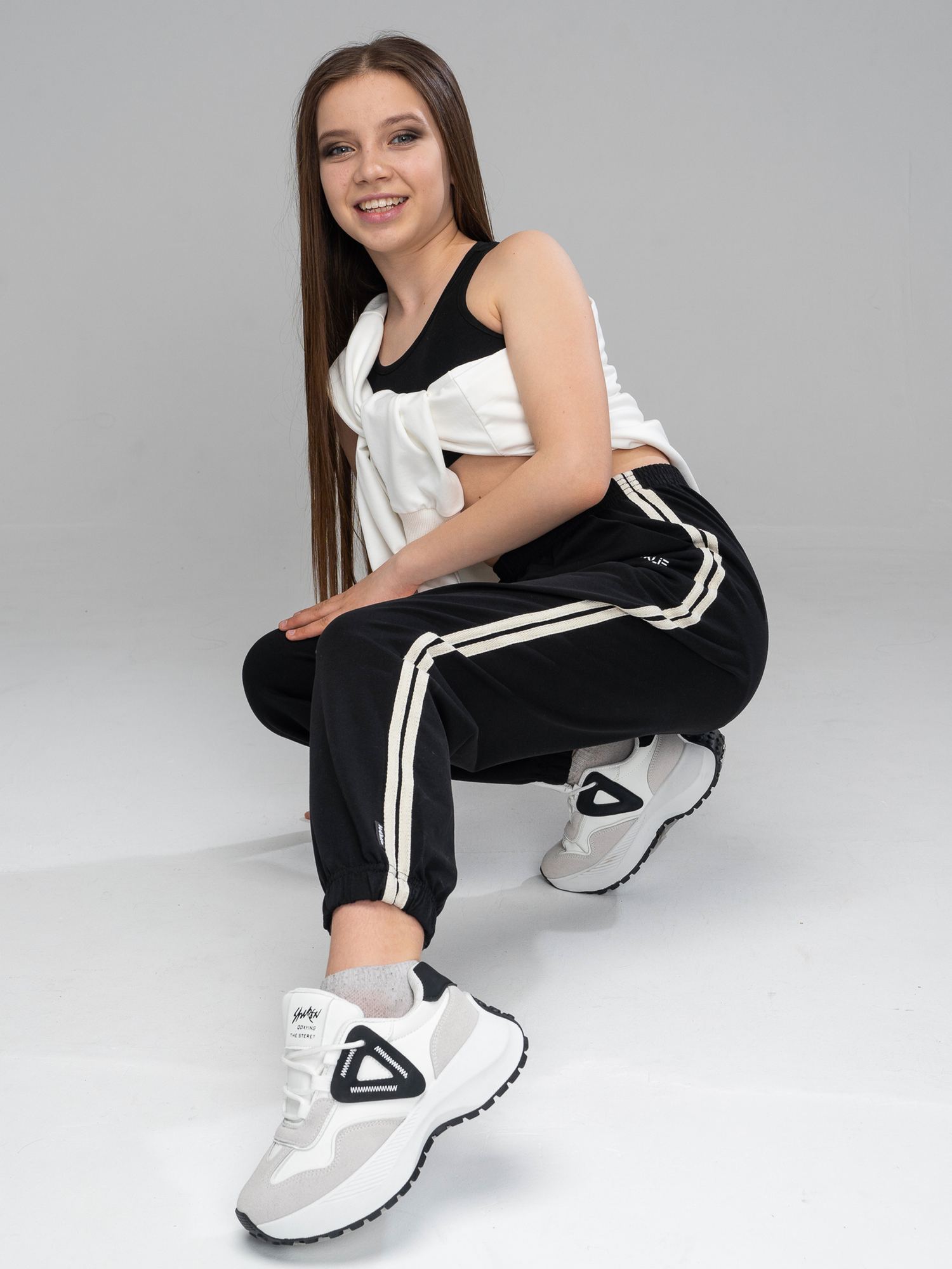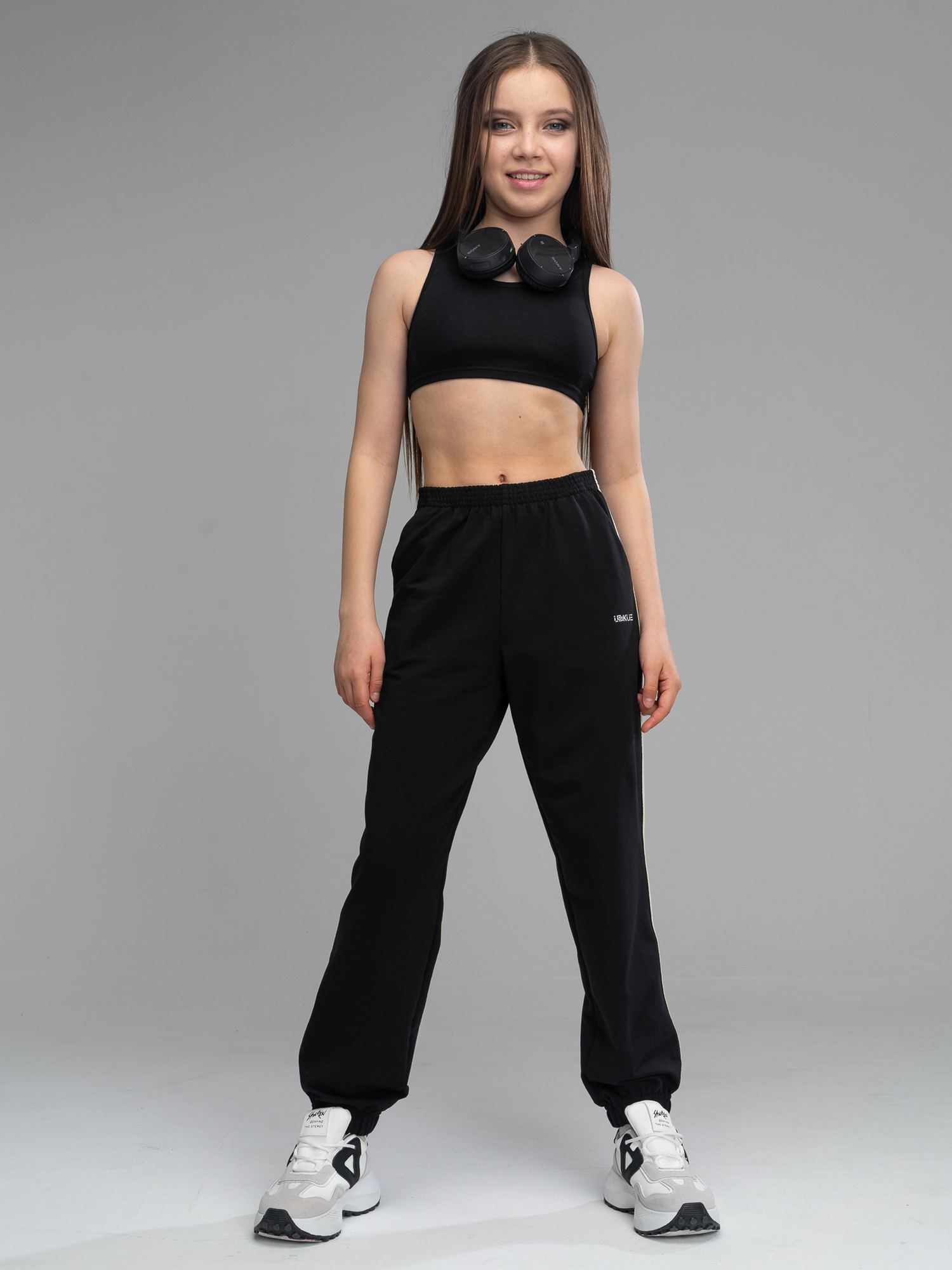 Широкие брюки из футера черного цвета свободного силуэта с карманами в боковых швах, лампасами и резинкой по низу. Трико спортивное сшиты из трикотажа высшего качества Пенье, содержащего 92% хлопка, 8% полиэстер. Спортивки тренировочные детские из футера черного цвета устойчивы к образованию катышков. Брюки без утепления и без начеса подходят на летний, весенний и осенний периоды. Треники комфортны в школу на физкультуру как спортивная форма, для занятия спортом, как одежда для подростка, для дома как домашняя одежда. Стильные широкие штаны подходят для танцев, хип хоп и других направлений. Подростковые брюки современного свободного кроя с удобной посадкой. Трикотажные спортивные штаны станут отличным подарком для ребенка, подростка по любому поводу. Изделие выполнено из трикотажа премиального качества - ПЕНЬЕ, с содержанием хлопка более 92%