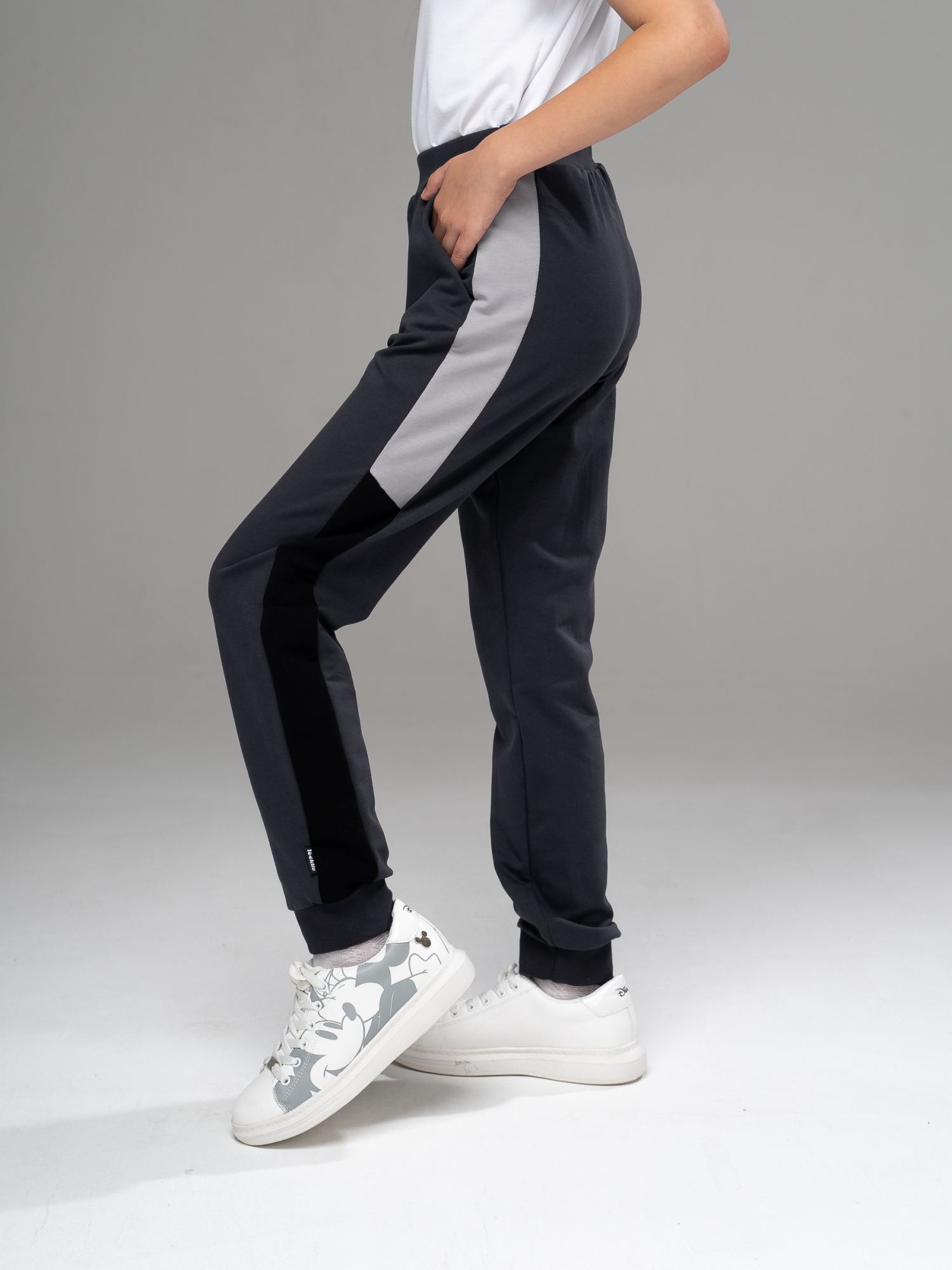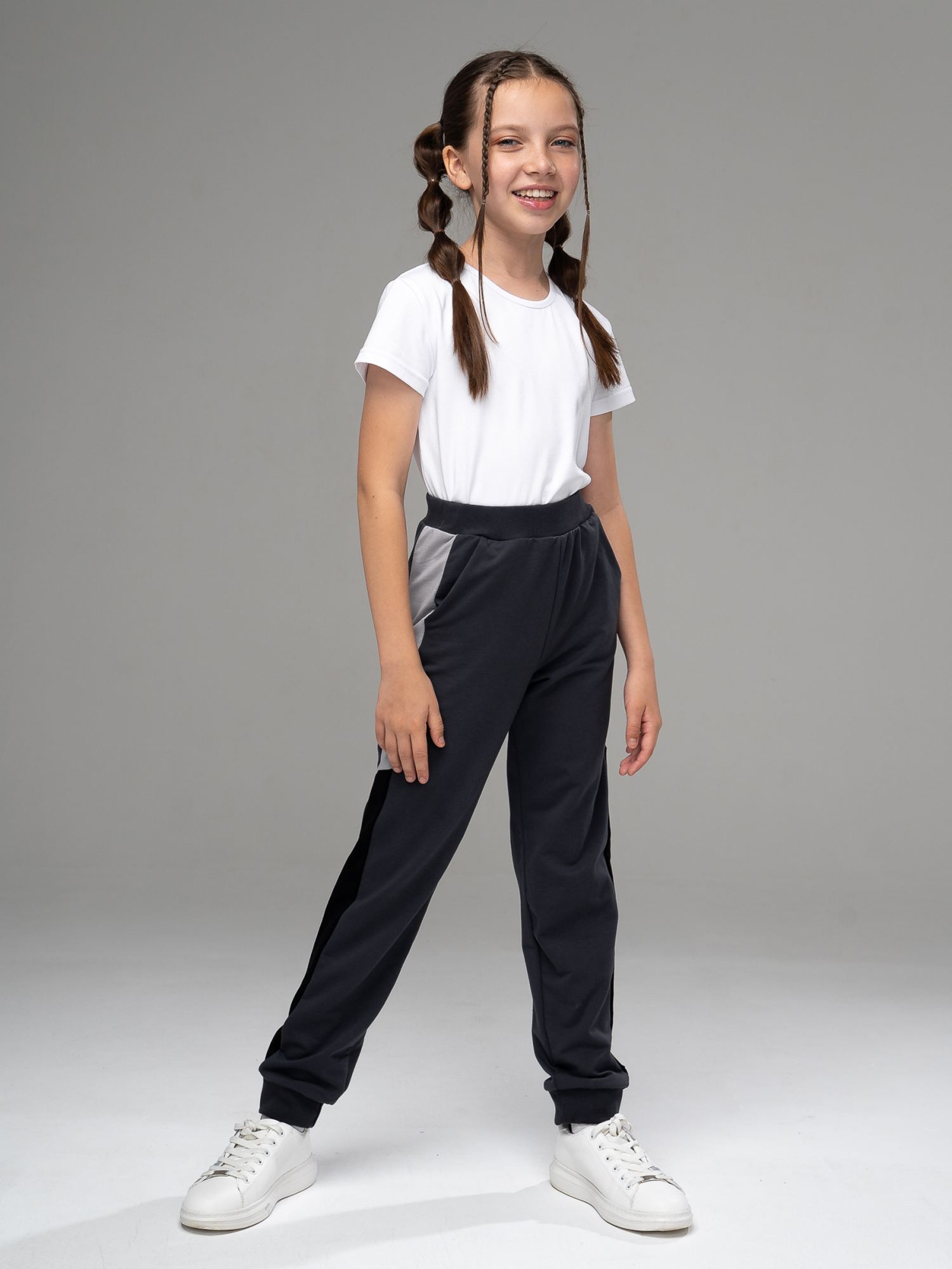 Спортивные брюки из футера антрацитового цвета , слегка зауженного силуэта с боковыми карманами и широкими лампасами из отделочного полотна двух цветов. Пояс на эластичной резинке. Низ брюк на манжетах. Изделие выполнено из трикотажа премиального качества - ПЕНЬЕ, с содержанием хлопка более 92%