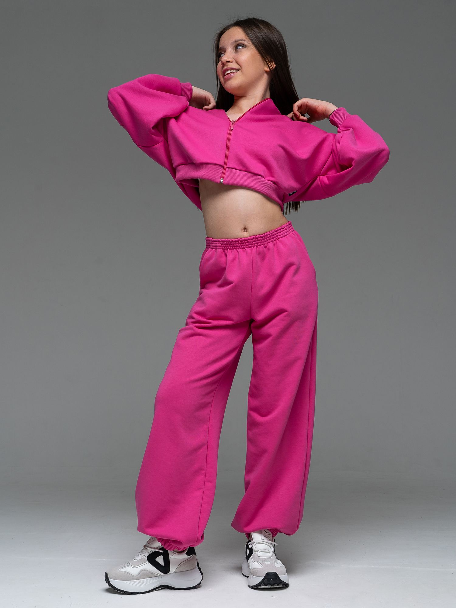 Широкие брюки из футера(3х нитка) сиреневого(фуксия) цвета свободного силуэта с карманами в боковых швах и резинкой по низу. Трико спортивное сшиты из трикотажа высшего качества Пенье, содержащего 92% хлопка, 8% полиэстер. Спортивки тренировочные детские из футера(3х нитка) сиреневого(фуксия) цвета устойчивы к образованию катышков. Брюки без утепления и без начеса подходят на летний, весенний и осенний периоды. Треники комфортны в школу на физкультуру как спортивная форма, для занятия спортом, как одежда для подростка, для дома как домашняя одежда. Стильные широкие штаны подходят для танцев, хип хоп и других направлений. Подростковые брюки современного свободного кроя с удобной посадкой. Трикотажные спортивные штаны станут отличным подарком для ребенка, подростка по любому поводу.