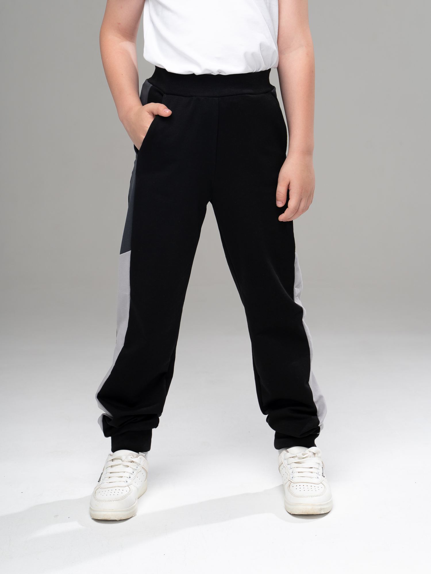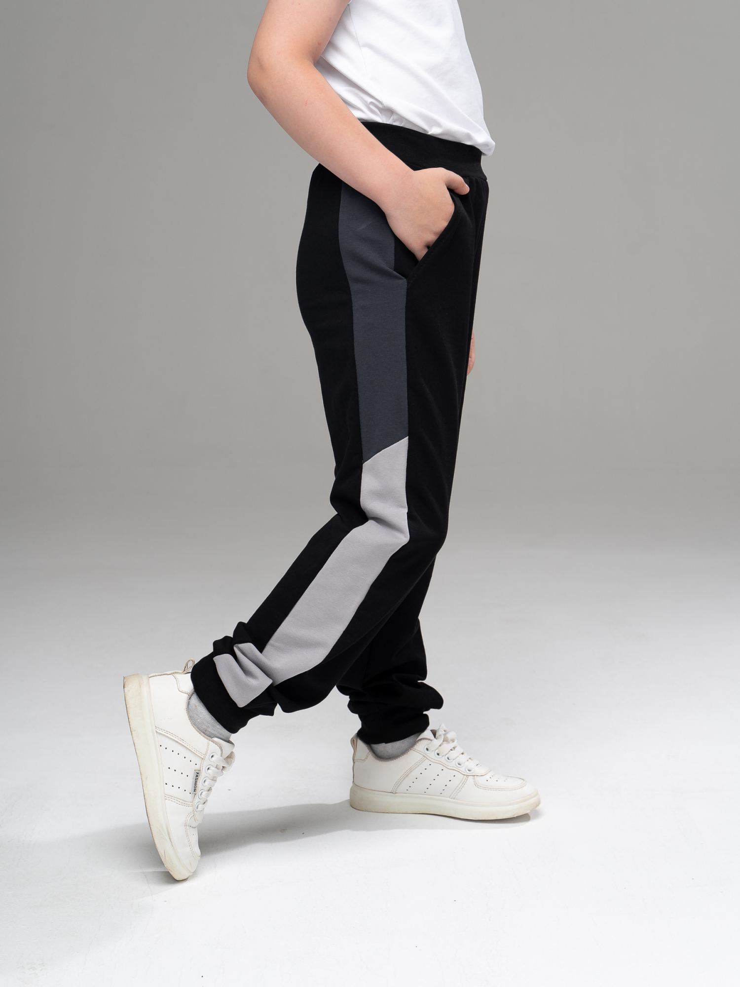 Спортивные брюки из футера черного цвета , слегка зауженного силуэта с боковыми карманами и широкими лампасами из отделочного полотна двух цветов. Пояс на эластичной резинке. Низ брюк на манжетах. Изделие выполнено из трикотажа премиального качества - ПЕНЬЕ, с содержанием хлопка более 92%