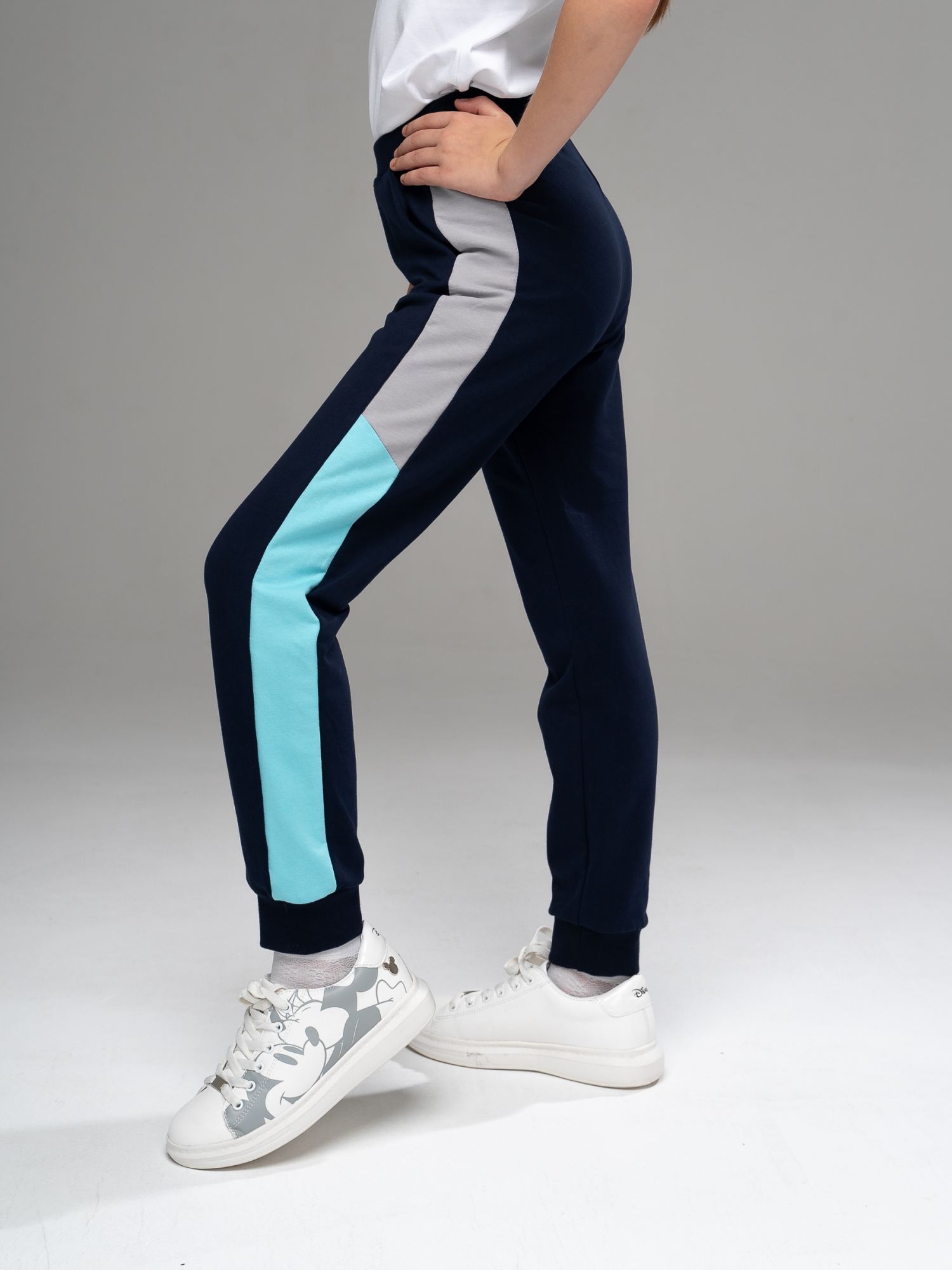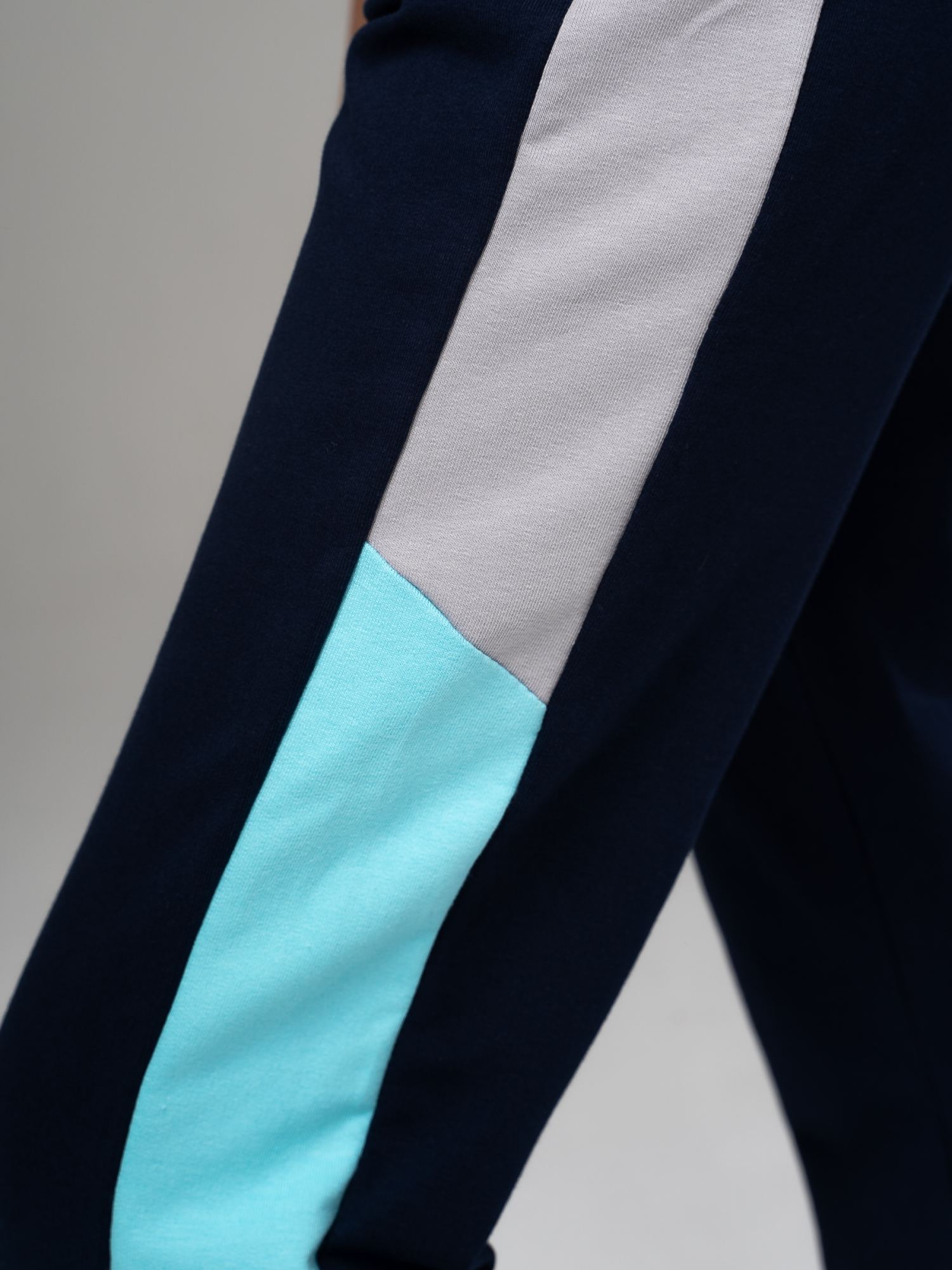 Спортивные брюки из футера темно-синего цвета , слегка зауженного силуэта с боковыми карманами и широкими лампасами из отделочного полотна двух цветов. Пояс на эластичной резинке. Низ брюк на манжетах. Изделие выполнено из трикотажа премиального качества - ПЕНЬЕ, с содержанием хлопка более 92%