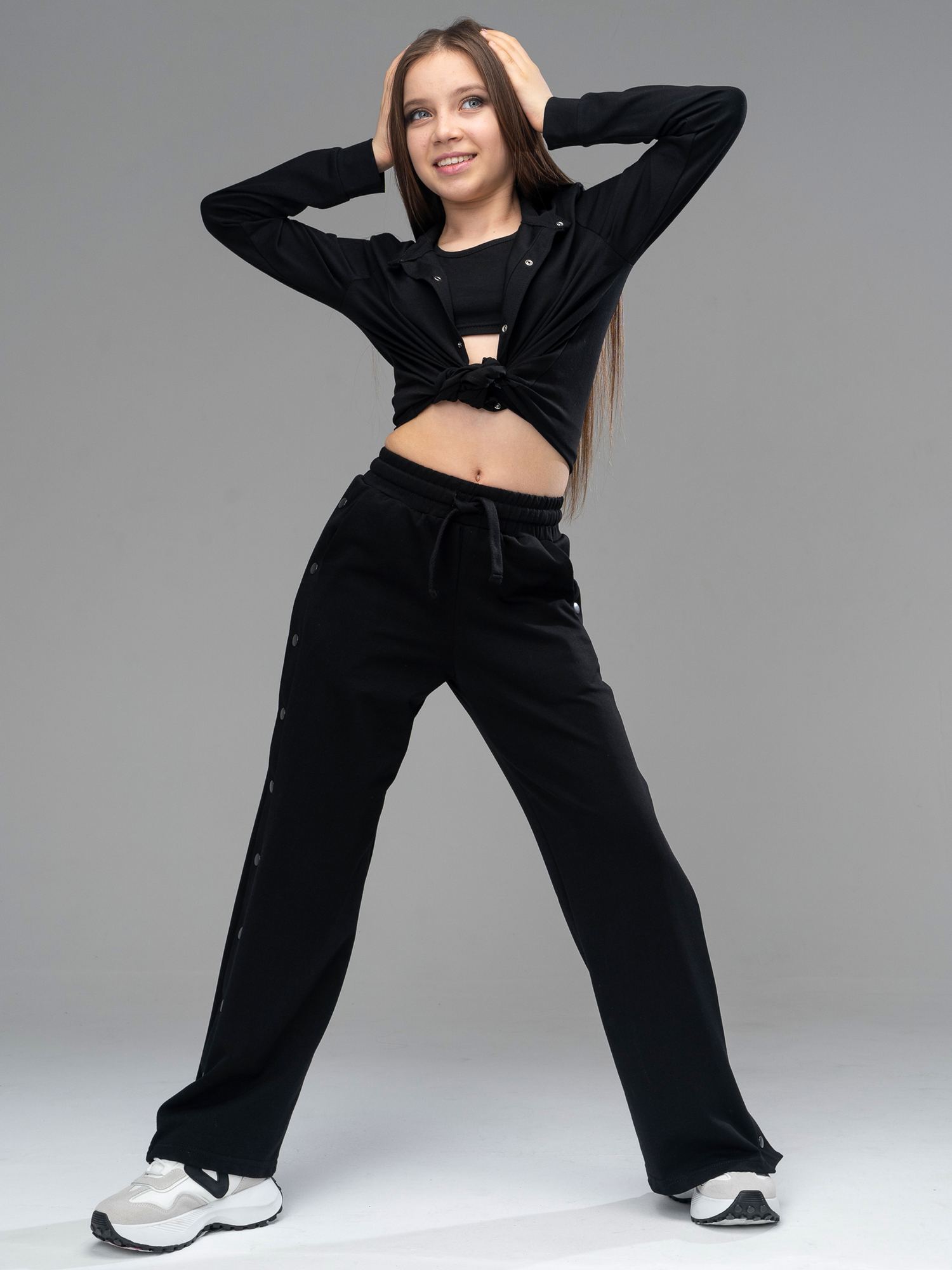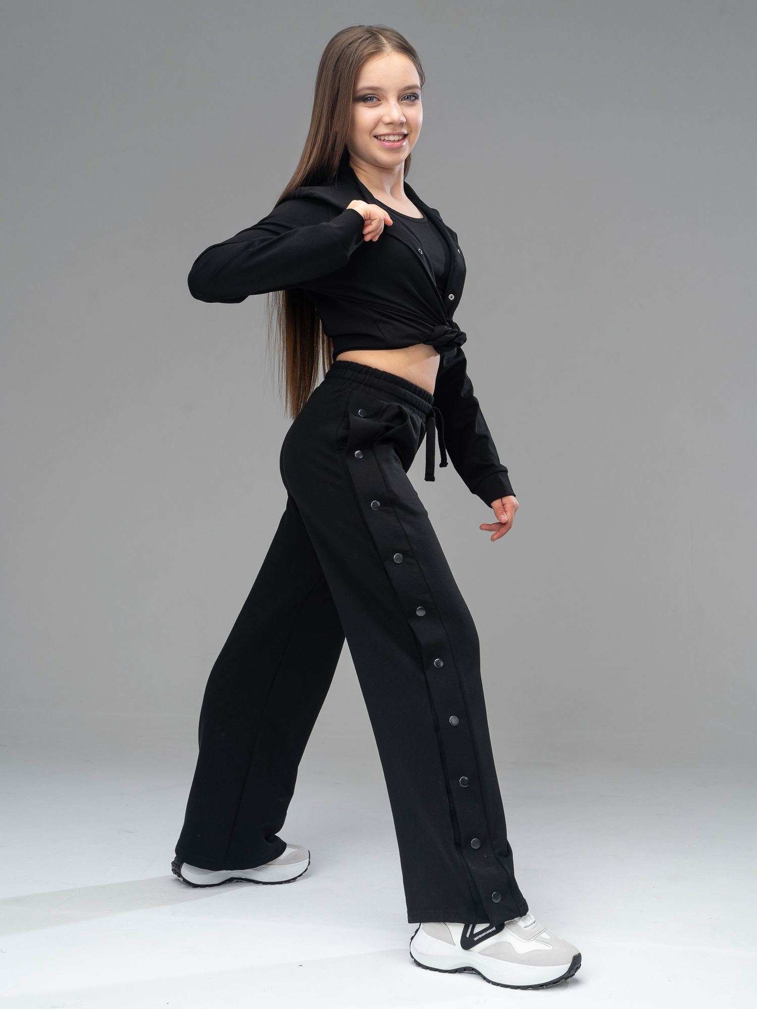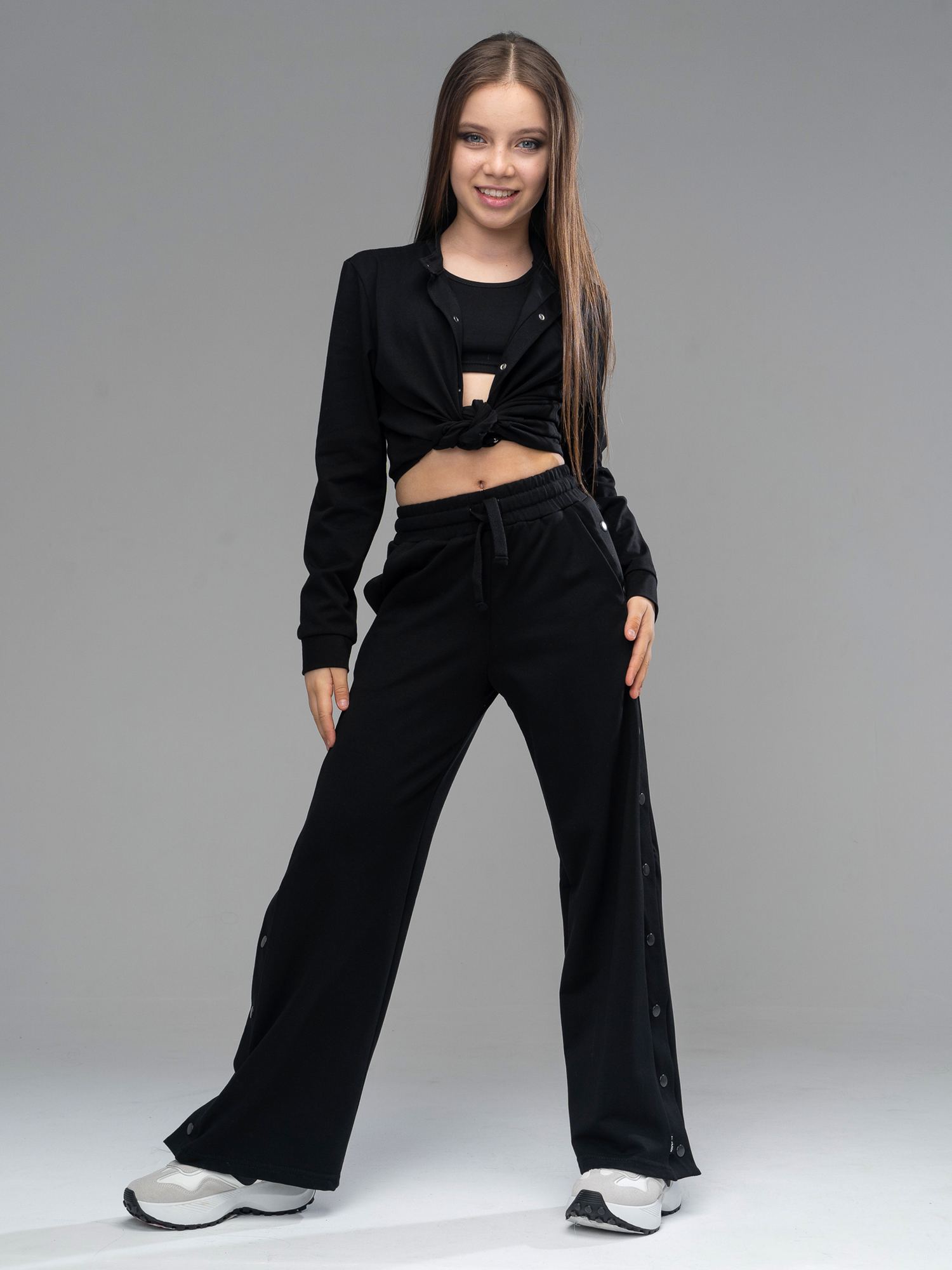 Брюки-палаццо свободного силуэта из футера черного цвета для девочки с боковыми карманами и с лампасами - это идеальное сочетание комфорта, качества, стиля и практичности. Стильные спортивные брюки с лампасами не только модные, но и практичные. Спортивные брюки для девочки выполнены из футера 2х нитки высшего качества Пенье. Брюки для девочки имеют следующий состав ткани - 92% хлопок, 8% полиэстер. Детские брюки имеют стильные лампасы с застежкой на кнопки по всей длине. Пояс детских брюк на резинке со шнуоком. Спортивные детские летние штаны свободного силуэта с боковыми карманами устойчивы к образованию катышек. Одним из ключевых преимуществ брюк - отсутствие утепления, начеса и флиса. Это означает, что Ваш ребенок может носить их весной и летом. Спортивные брюки для девочки комфортны в школу на физкультуру как спортивная форма, для занятия спортом, как одежда для подростка, для дома как домашняя одежда. Стильные широкие штаны для девочек подходят для танцев, хип хоп и других направлений. Брюки современного свободного кроя с удобной посадкой. Летние трикотажные спортивные штаны станут отличным подарком по любому поводу. Изделие выполнено из трикотажа премиального качества - ПЕНЬЕ, с содержанием хлопка более 92%