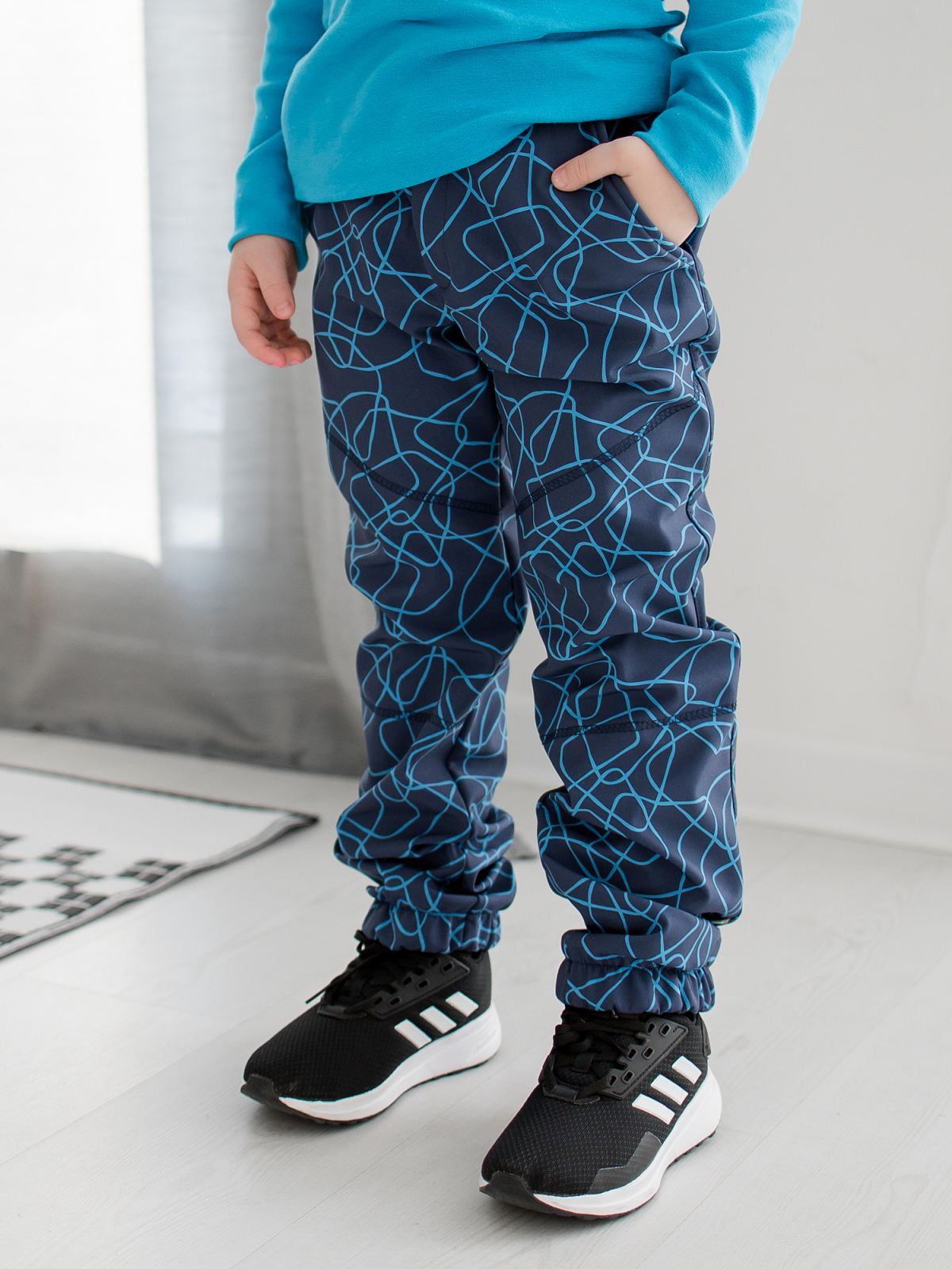 Брюки прямого силуэта из мембраны с флисовой подкладкой темно-синего цвета . Мембранное покрытие обеспечивает сохранение тепла и воздухообмен. Передние половинки брюк украшены отделочными строчками и имитацией гульфика. Брюки с боковыми карманами. Задняя часть брюк на кокетке. Пояс составной - передняя часть из основного материала, боковая и задняя часть пояса из резинки. Низ брюк на эластичной резинке.