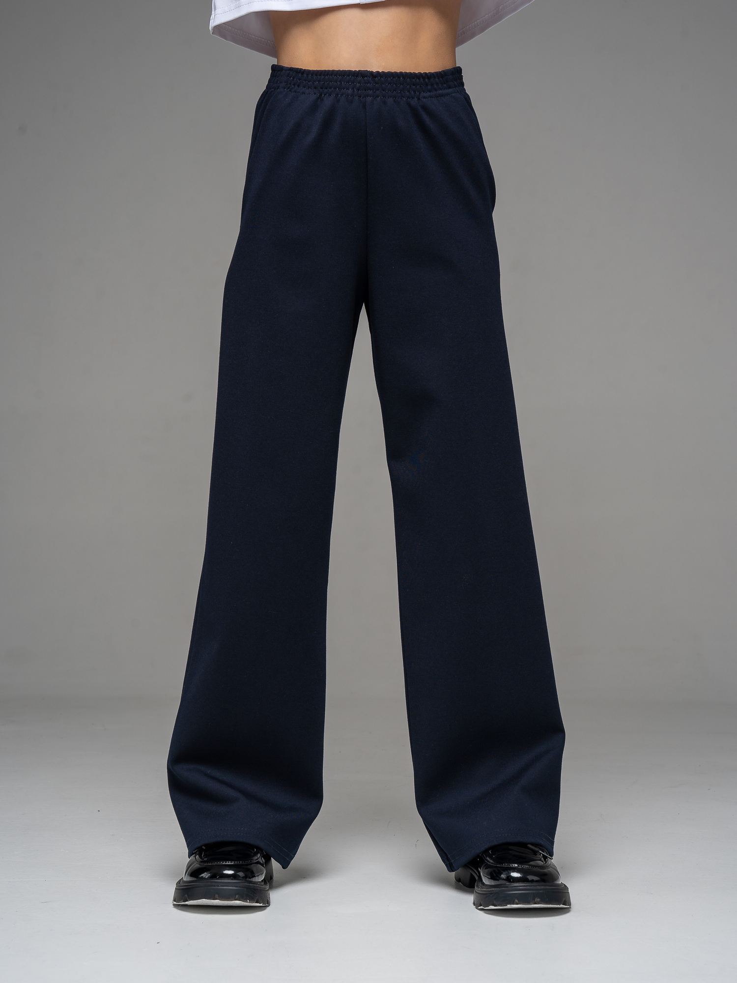 Стильные брюки-палаццо с боковыми карманами из джерси темно-синего цвета для девочки. Цельнокроенный пояс на эластичной резинке.