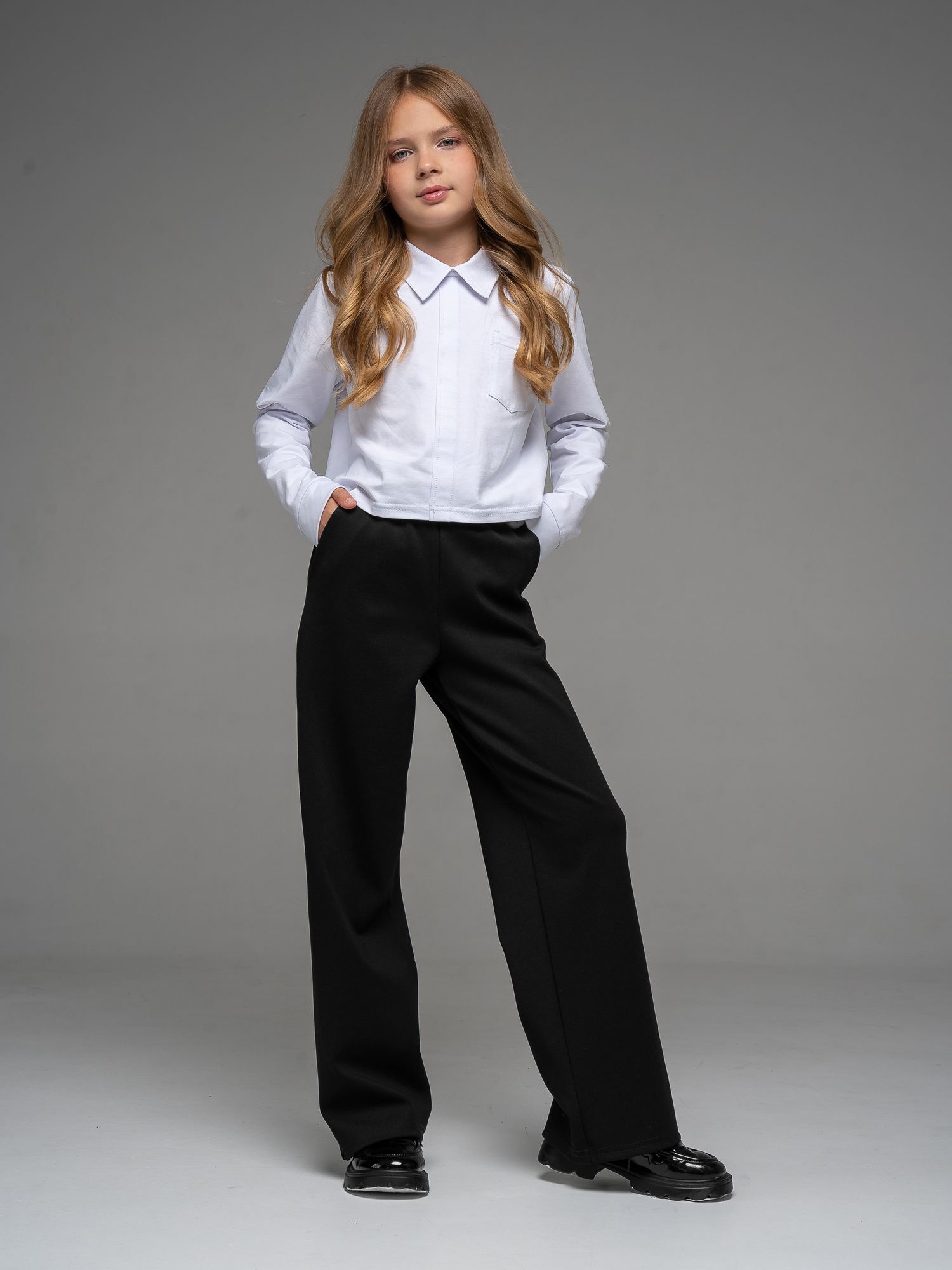 Стильные брюки-палаццо с боковыми карманами из джерси с начесом черного цвета для девочки. Цельнокроенный пояс на эластичной резинке.