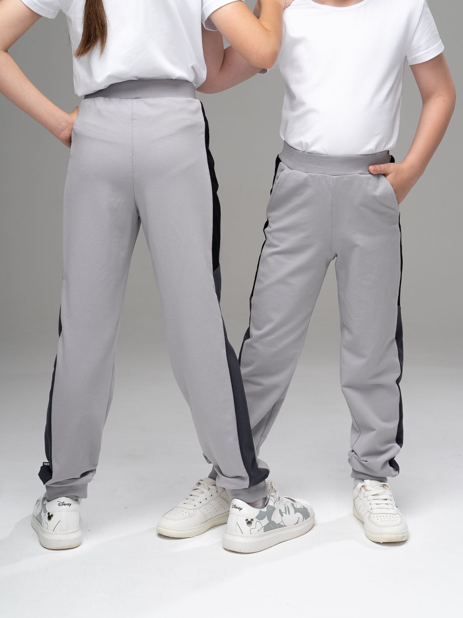 Спортивные брюки из футера серого цвета , слегка зауженного силуэта с боковыми карманами и широкими лампасами из отделочного полотна двух цветов. Пояс на эластичной резинке. Низ брюк на манжетах. Изделие выполнено из трикотажа премиального качества - ПЕНЬЕ, с содержанием хлопка более 92%