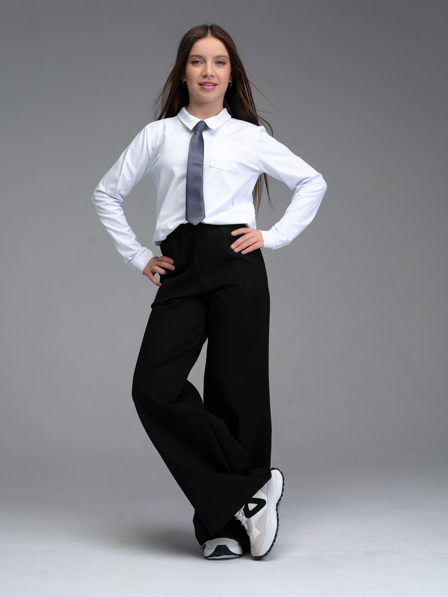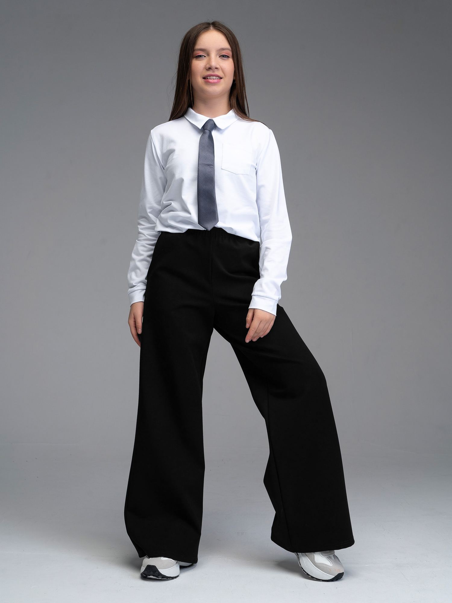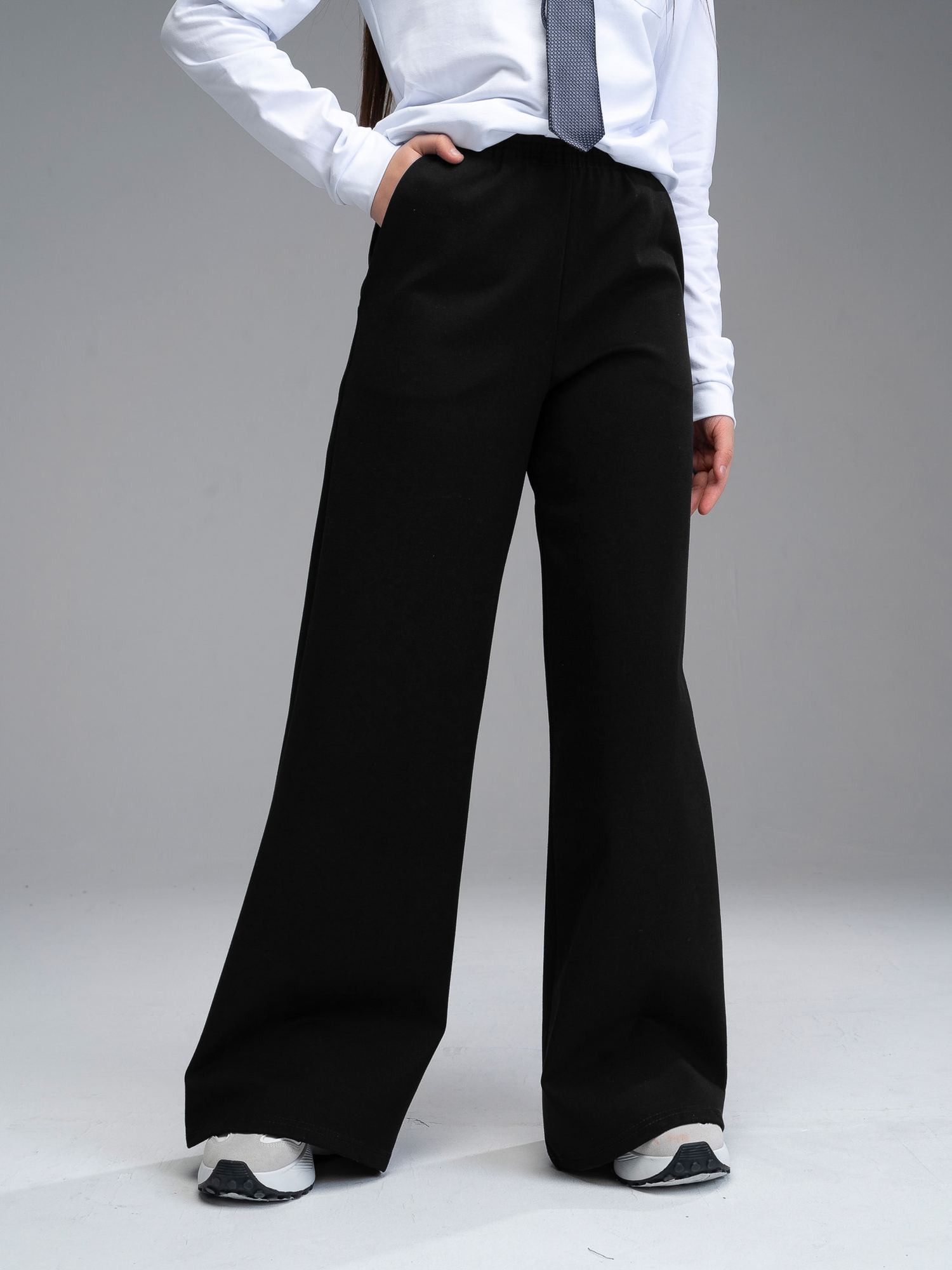 Стильные широкие брюки-палаццо с боковыми карманами из джерси с начесом черного цвета для девочки. Цельнокроенный пояс на эластичной резинке шириной 5 см.