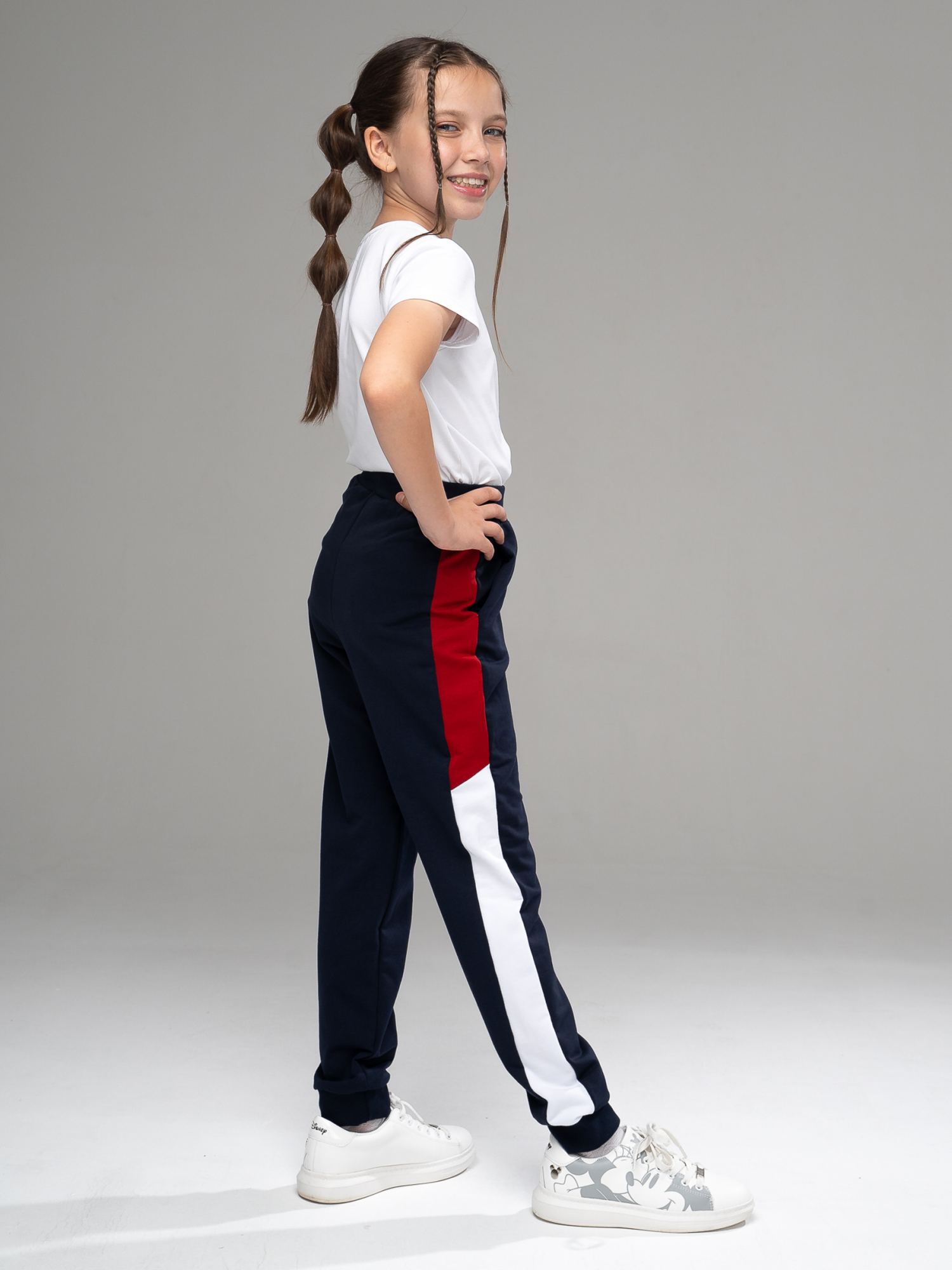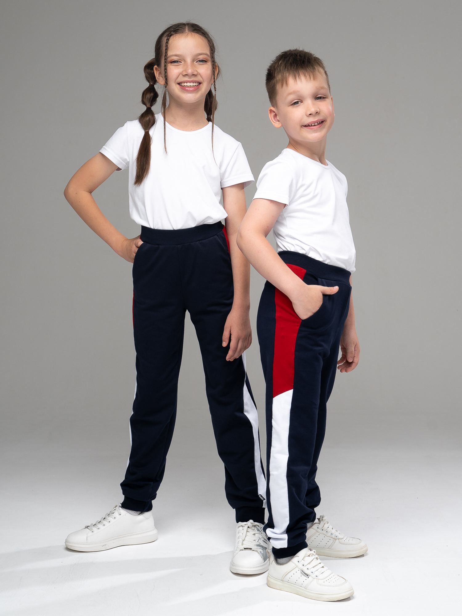 Спортивные брюки из футера темно-синего цвета , слегка зауженного силуэта с боковыми карманами и широкими лампасами из отделочного полотна двух цветов. Пояс на эластичной резинке. Низ брюк на манжетах. Изделие выполнено из трикотажа премиального качества - ПЕНЬЕ, с содержанием хлопка более 92%