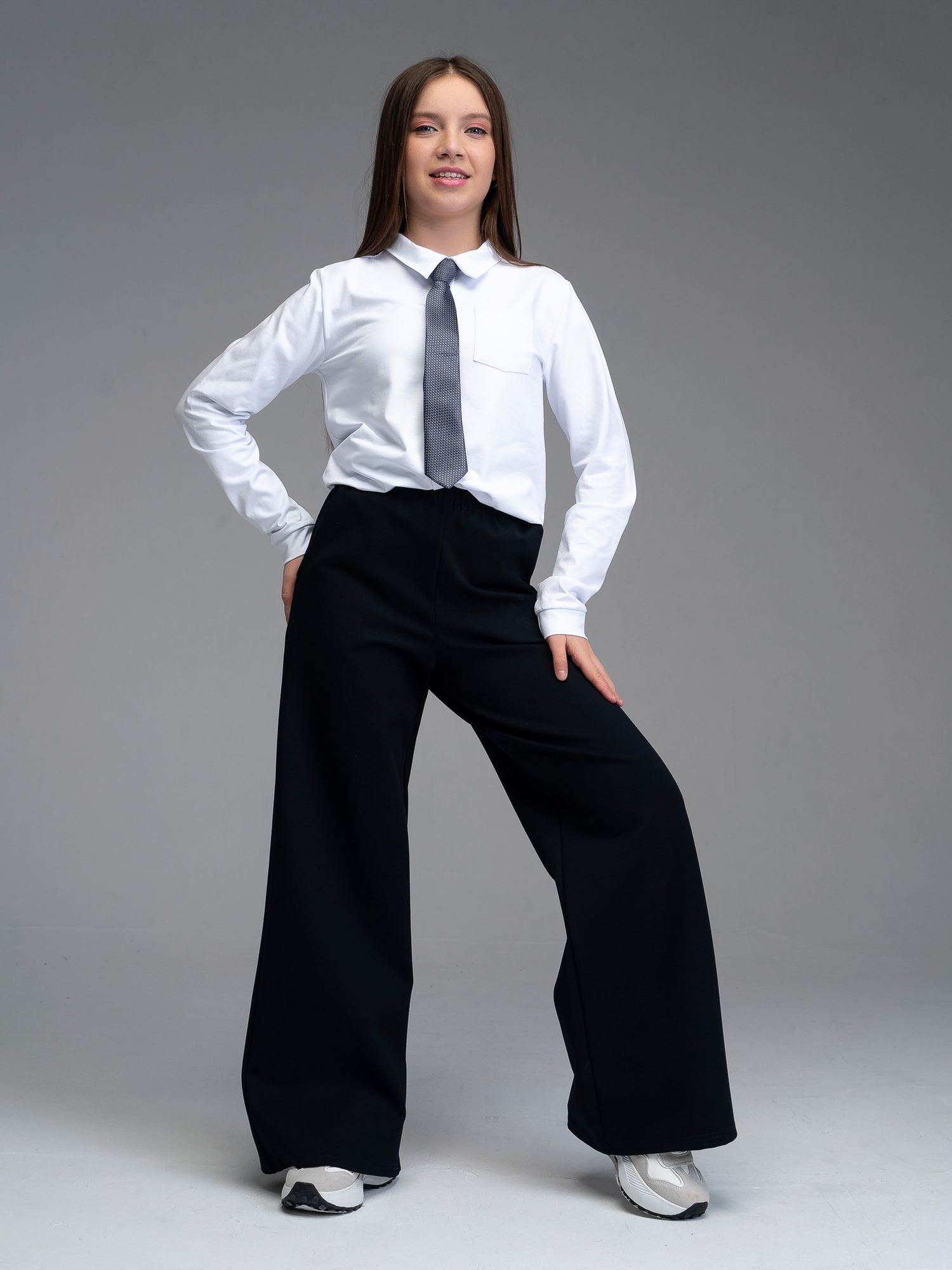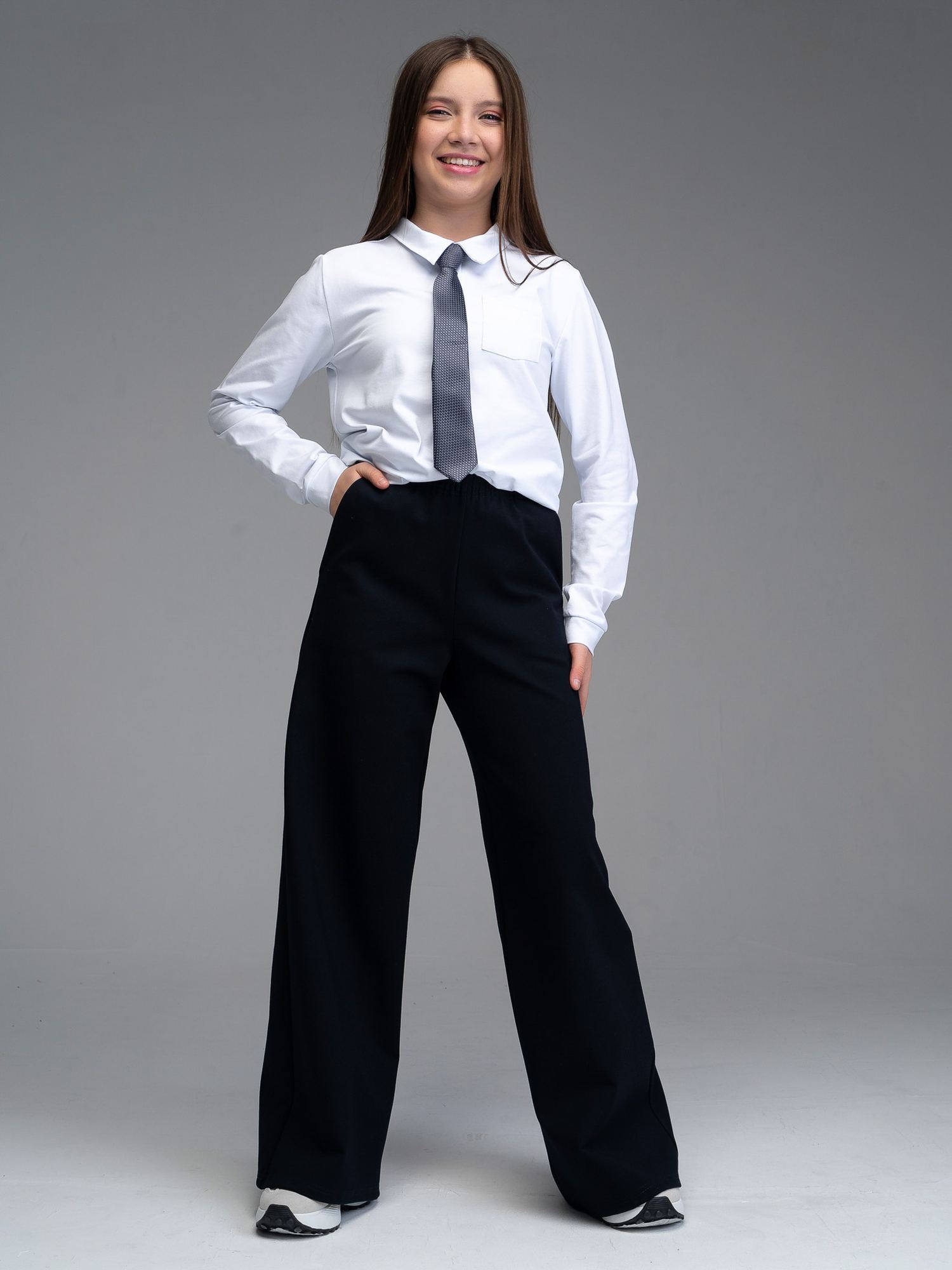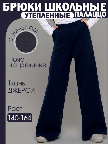 Стильные широкие брюки-палаццо с боковыми карманами из джерси с начесом темно-синего цвета для девочки. Цельнокроенный пояс на эластичной резинке шириной 5 см.