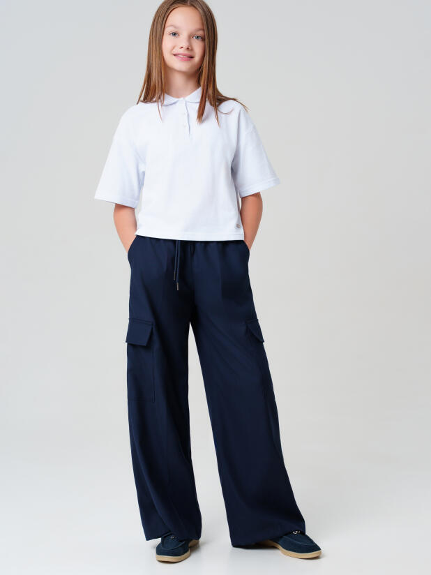 Благодаря свободному силуэту и широким штанинам девочке будет удобно в классе, на переменах и на прогулках после школы. Четыре кармана делают эти классические подростковые штаны ещё более функциональными: в классические и накладные карманы удобно положить телефон, ключи или другие необходимые мелочи.