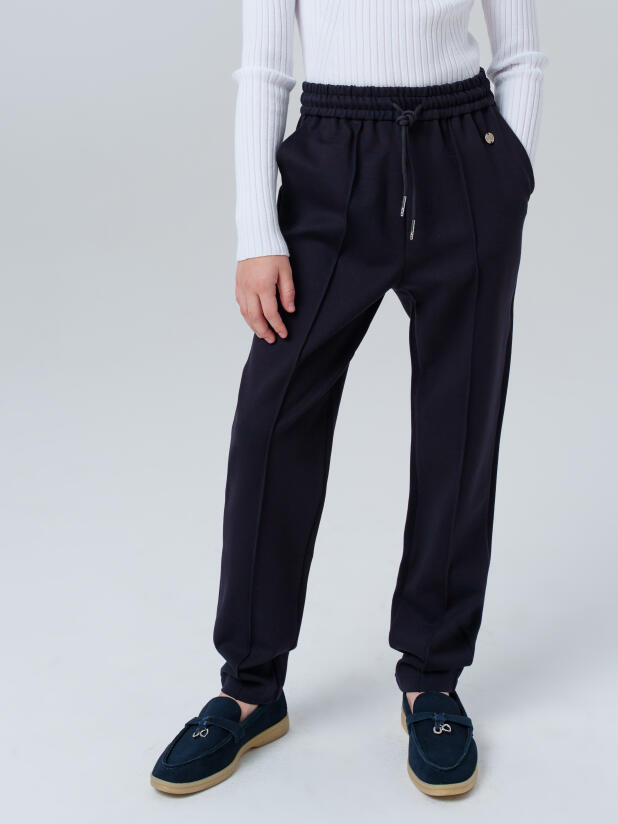 Свободный крой - comfort fit - со слегка зауженными брючинами не стесняет движений, обеспечивая максимальный комфорт на уроках и во время активных перемен. Эластичный пояс на мягкой резинке с регулируемым шнурком гарантирует идеальную посадку по фигуре. Боковые карманы добавляют модели практичности, а декоративные строчки спереди делают образ аккуратным и элегантным.