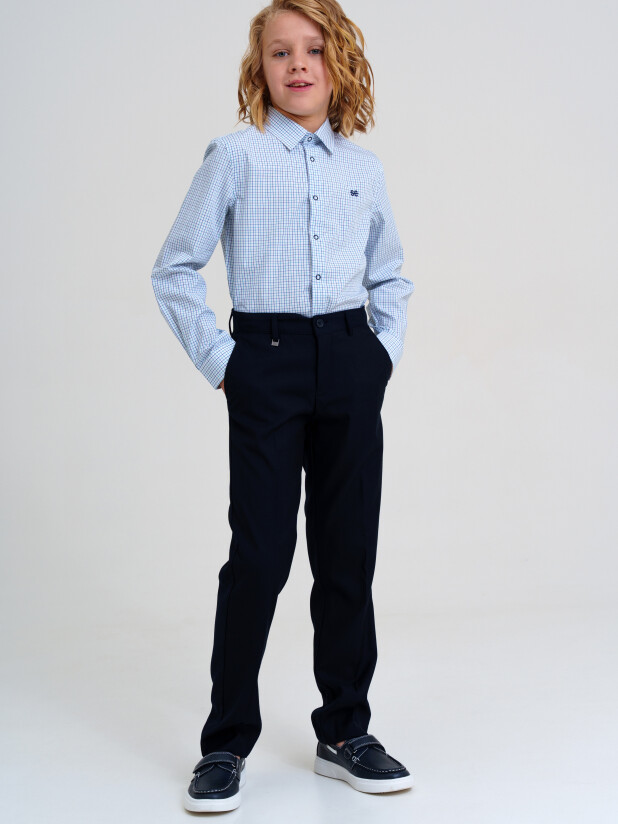 Классический крой делает эту модель уместной как для повседневных школьных будней, так и для праздничных мероприятий. Универсальные синие брюки для подростков легко сочетаются с рубашками, жилетами, пиджаками или футболками-поло.
