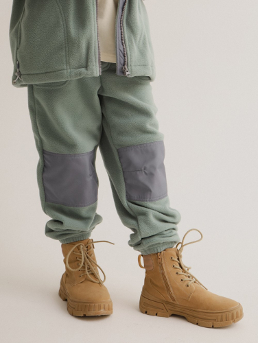Свободные брюки из флиса, пояс на брендированной помочной резинке. Усиление на коленях из плащевой ткани. 2 накладных кармана. Мягкие манжеты по низу изделия.