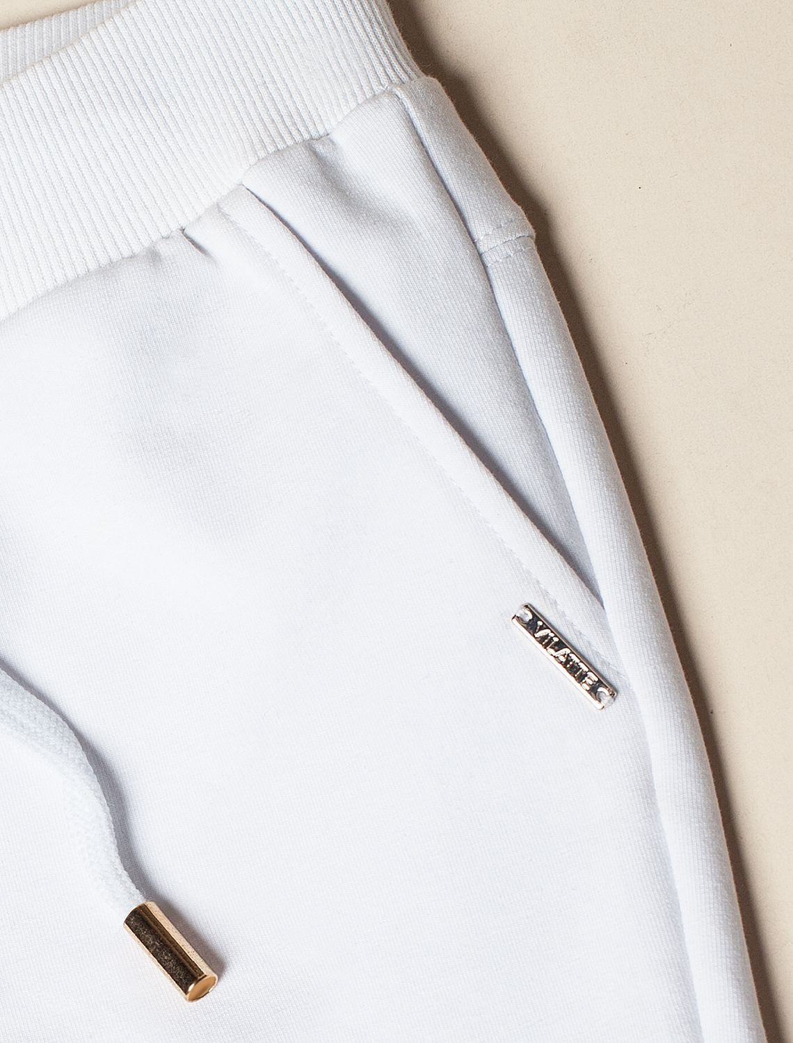 Белые джоггеры сшили из мягкого хлопкового трикотажа. Премиальный футер из 100% хлопка позволяет воздуху циркулировать и не раздражает кожу, а свободный крой модели не сковывает движения. За удобную посадку на талии отвечает широкий эластичный пояс с регулируемым шнурком. Модель дополнена высококачественной фурнитурой золотистого цвета. Идеально в костюме с худи F49.405