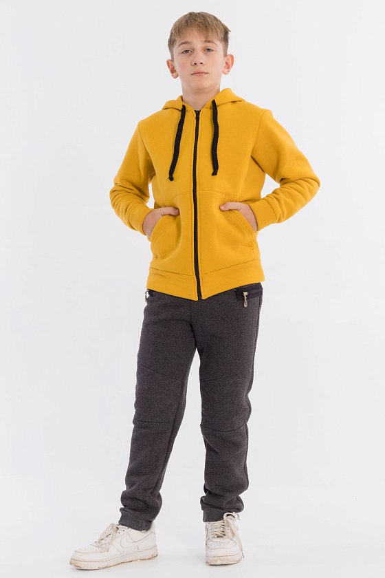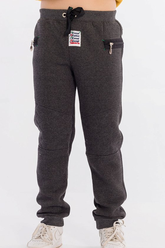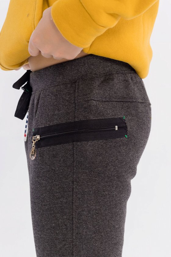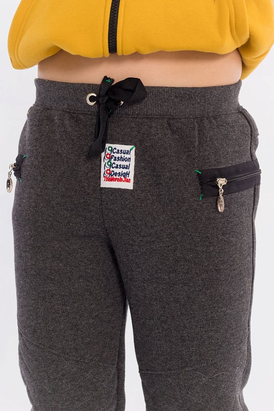 Брюки детские, однотонные (начёс 3-х нитка), с поясом на широкой резинке со шнуром. По бокам в качестве отделки вшита молния (имитация под карман), спереди декоративная нашивка. На коленях отстрочка нитками в цвет полотна, низ брюк на манжетах.