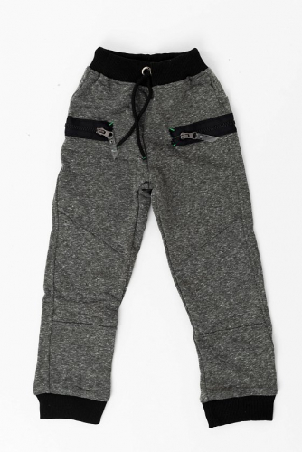 Брюки выполнены из однотонного футера с лайкрой. По бокам расположены отделочные вставки c принтом. Пояс брюк притачной на резине и шнуре.