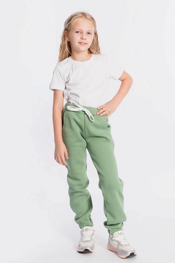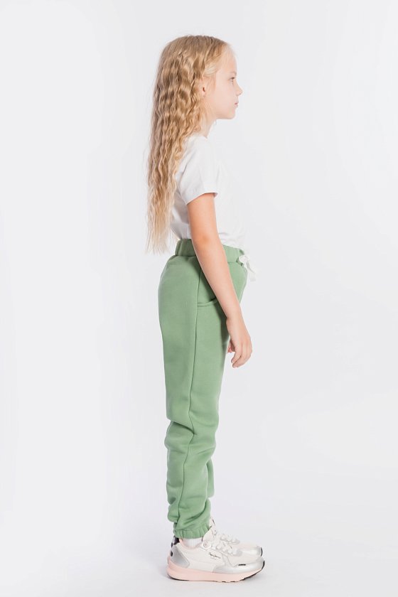 Тёплые, детские брюки выполнены из полотна с начёсом. По бокам расположены карманы, а для комфортной посадки в пояс вставлены шнур и резина. Низ брюк на резине.