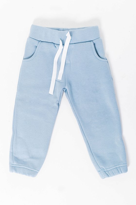 Тёплые, детские брюки выполнены из полотна с начёсом. По бокам расположены карманы, а для комфортной посадки в пояс вставлены шнур и резина. Низ брюк на резине.