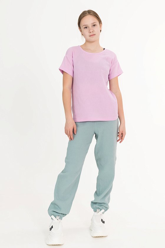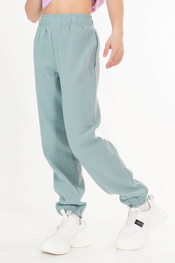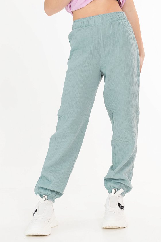 Детские летние брюки выполнены из муслина. Пояс и низ брюк на резинке.