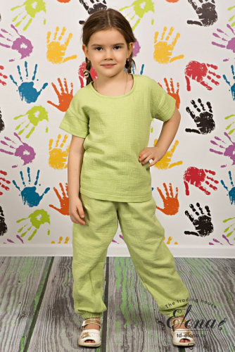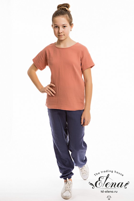 Детские летние брюки выполнены из муслина. Пояс и низ брюк на резинке.