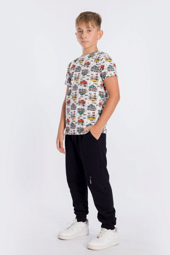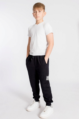 Брюки выполнены из футера двухнитки. Пояс на резине и шнуре, по бокам размещены карманы. Брюки оригинального кроя и с декоративными элементами в виде нашивки сбоку. Низ брюк с манжетами из кашкорсе.