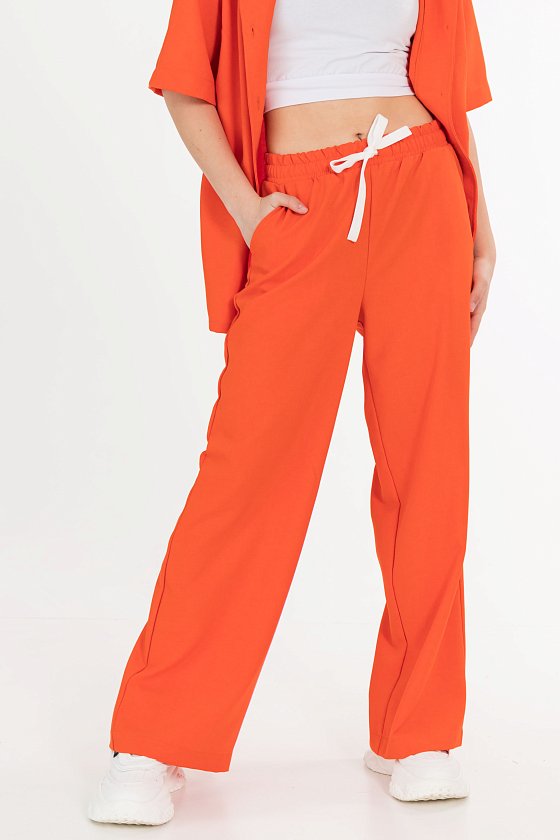 Брюки имеют свободный крой, пояс на резинке и шнуре, что обеспечивает комфортную посадку и позволяет регулировать обхват талии. Боковые карманы добавляют функциональность.