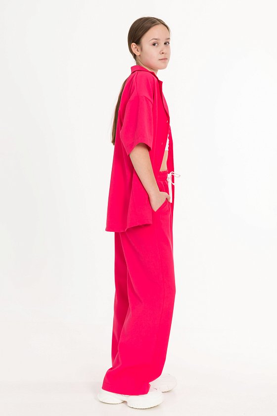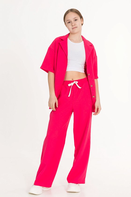 Брюки имеют свободный крой, пояс на резинке и шнуре, что обеспечивает комфортную посадку и позволяет регулировать обхват талии. Боковые карманы добавляют функциональность.