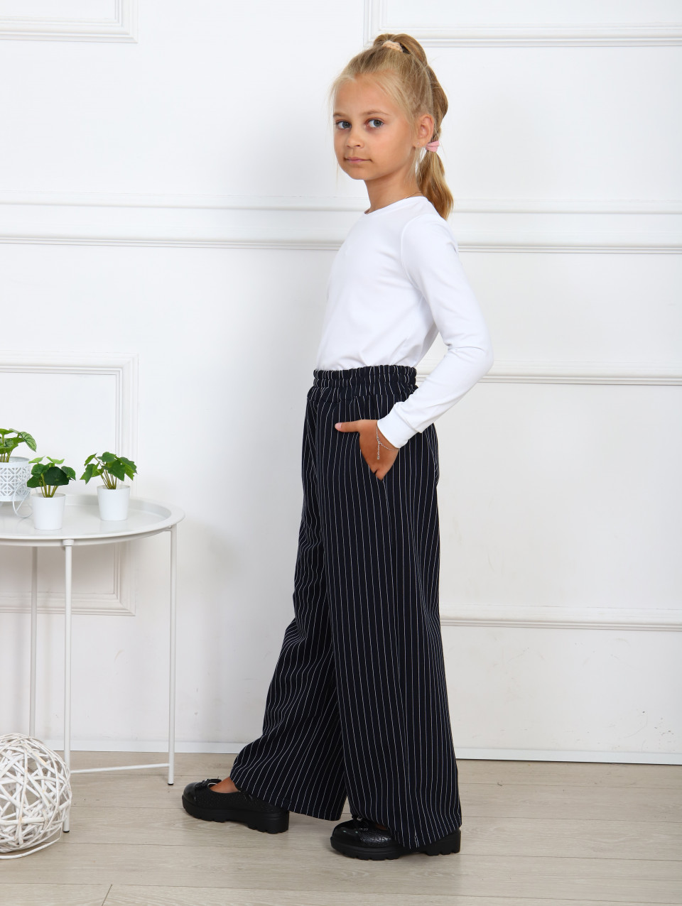 Модные брюки для девочек классические штрокие, удобные для школы прогулок на свежем воздухе и как домашний вариант. Изделие выполнено из натурального материала, который дарит ощущение комфорта и позволяет телу дышать. Свободный крой не сковывает движения, позволяя ребенку быть активным. Прослужит долго и никогда не станет лишними в гардеробе. Отличный подарок для девочки. Рекомендована бережная стирка при температуре не выше 30 градусов, деликатный или ручной режим, вывернув изделие на изнаночную сторону. Материал футер петля