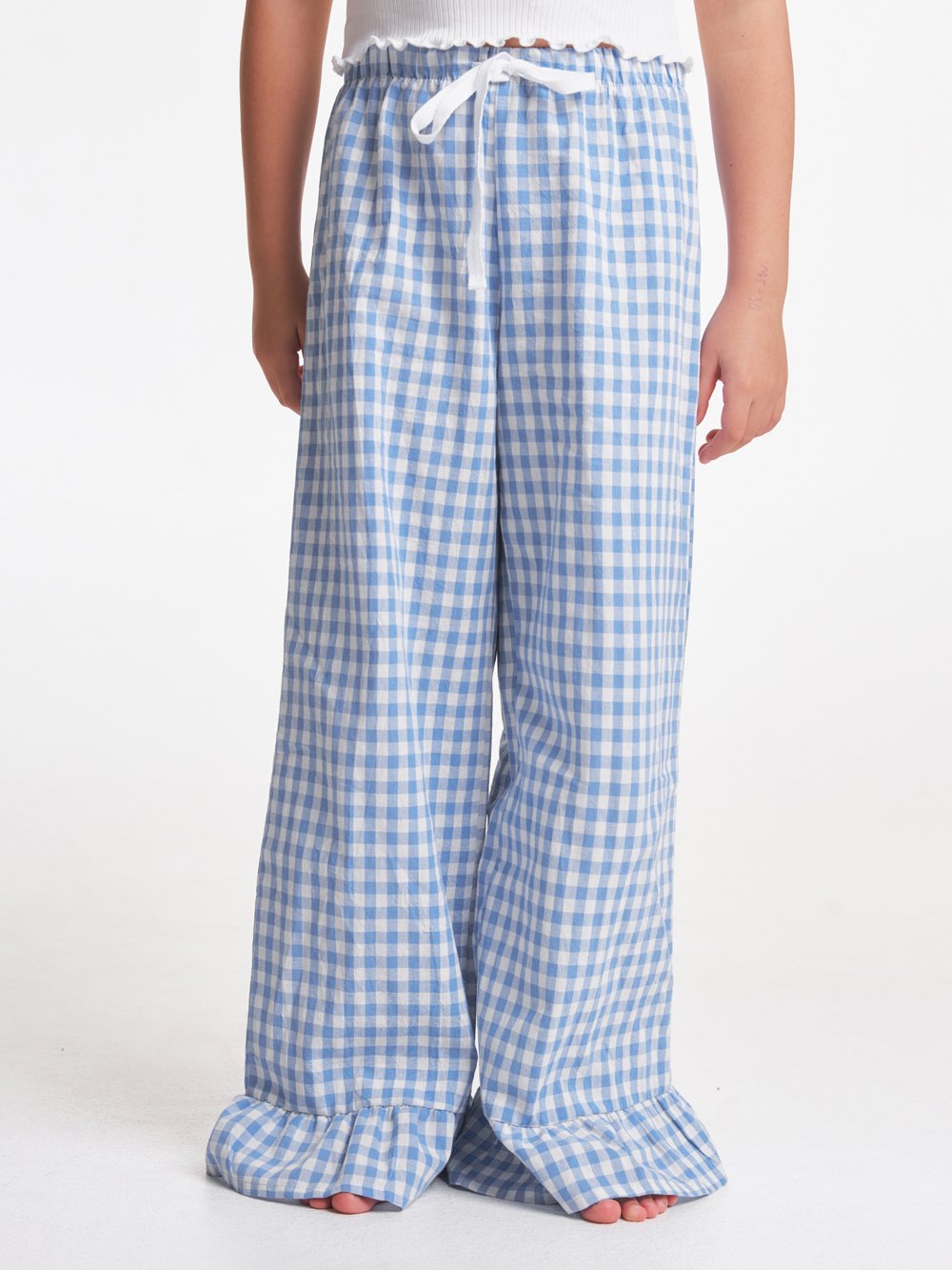 Брюки свободного силуэта  из  хлопка с мятым эффектом. Пояс на резинке со шнурком. Рюши по низу штанин.