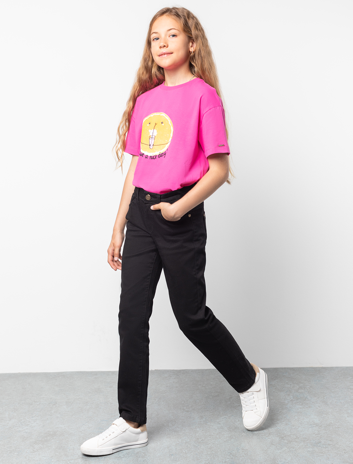 Универсальный черный цвет делает эти брюки-скини с двумя боковыми карманами удачным решением для создания школьного образа. Модель сшили из мягкого прочного твила на основе хлопка. За счет входящего в состав материала эластана изделие не деформируется после частых стирок. Объем в талии регулируется перфорированной резинкой в поясе, перестёгивающейся на пуговицу.