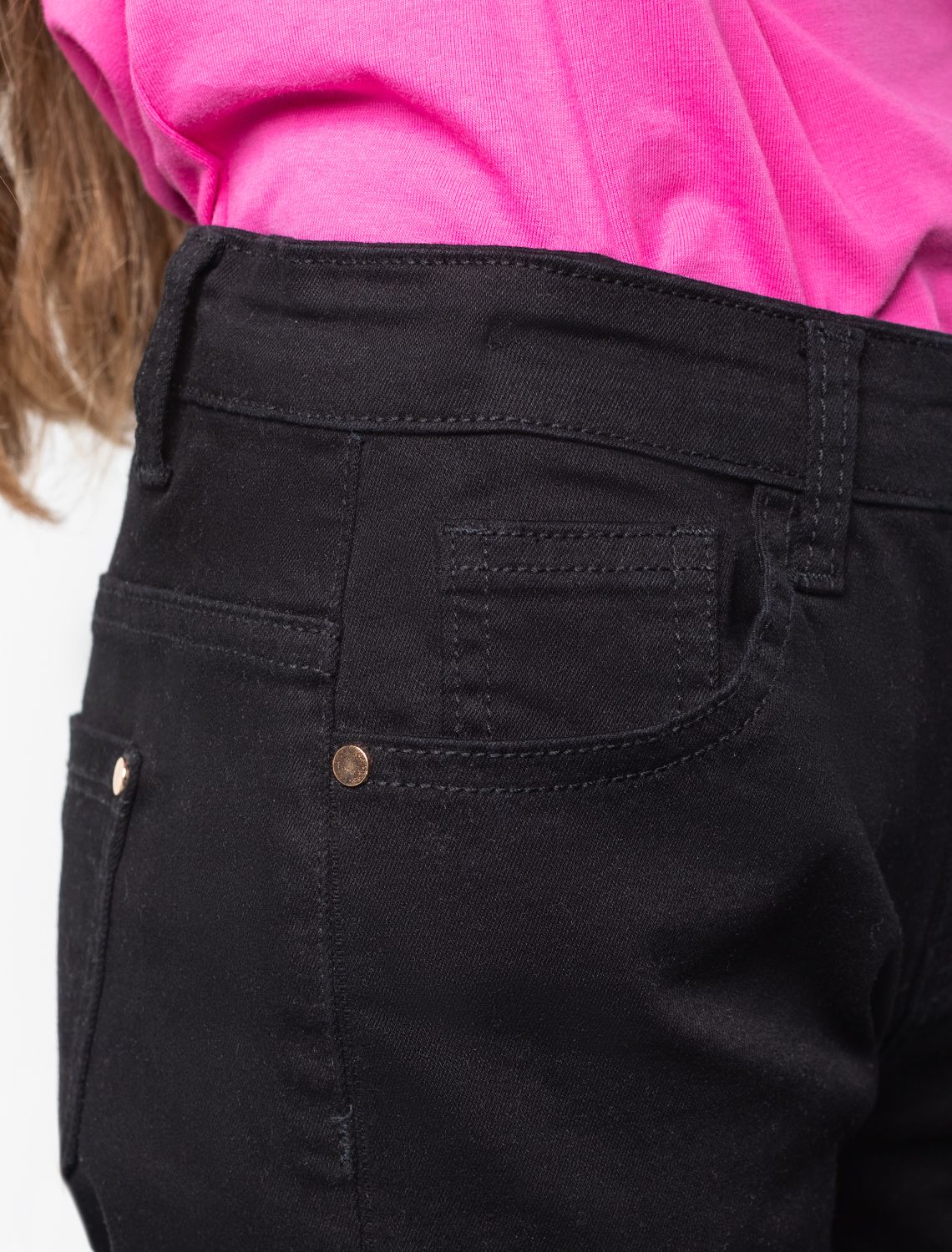 Универсальный черный цвет делает эти брюки-скини с двумя боковыми карманами удачным решением для создания школьного образа. Модель сшили из мягкого прочного твила на основе хлопка. За счет входящего в состав материала эластана изделие не деформируется после частых стирок. Объем в талии регулируется перфорированной резинкой в поясе, перестёгивающейся на пуговицу.