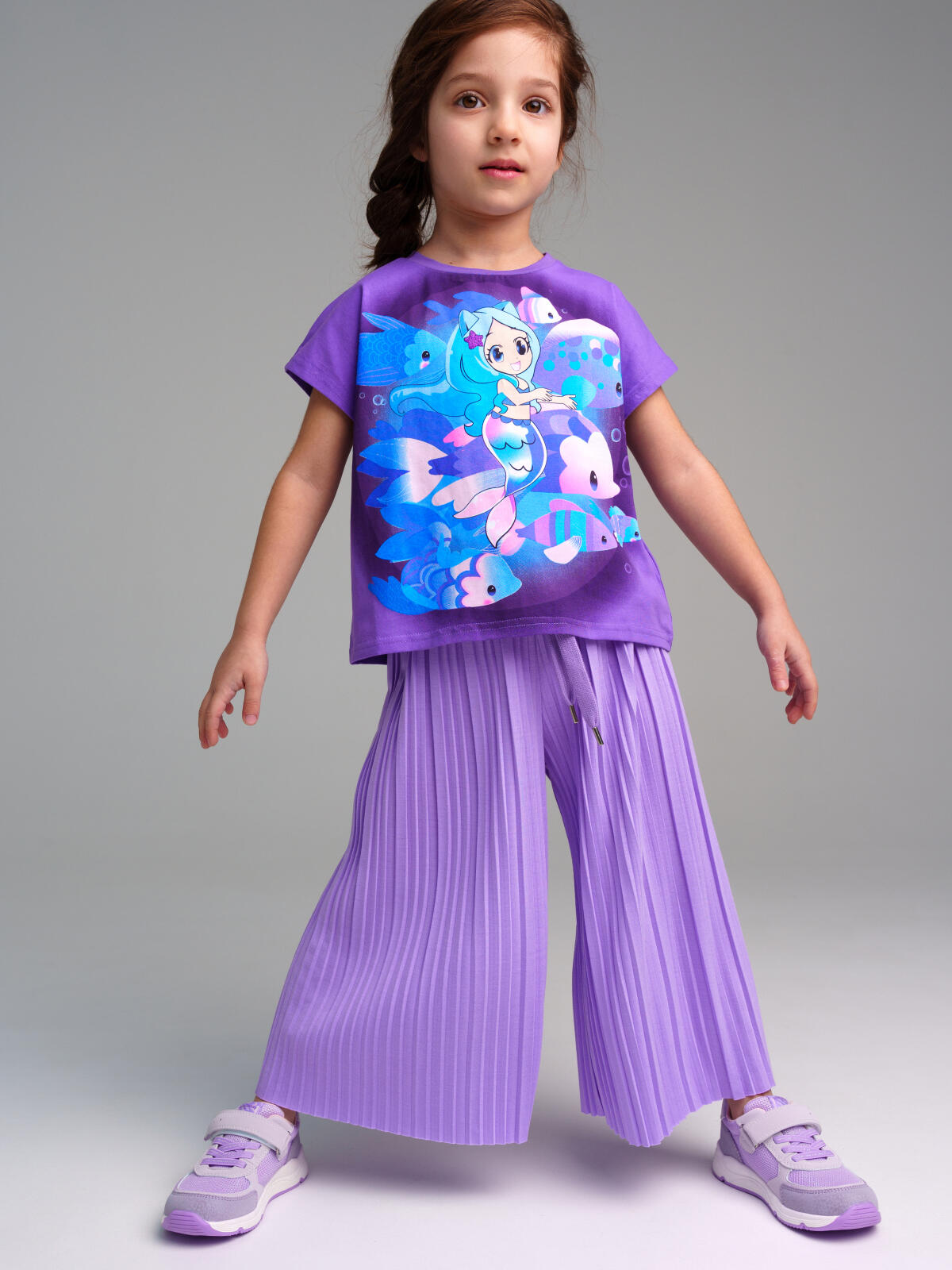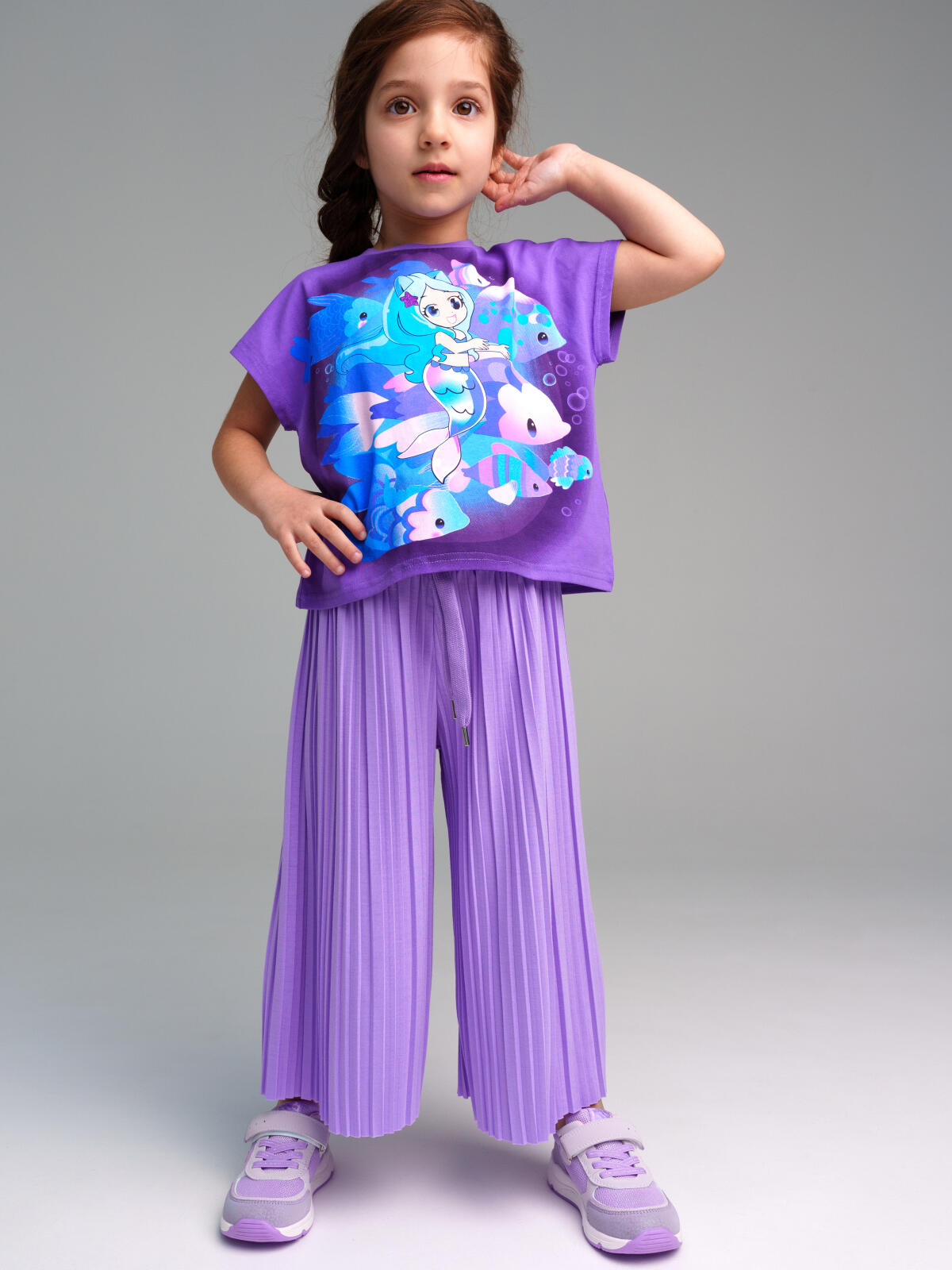 Кюлоты из плиссированного трикотажа. Высокое содержание хлопка. Благодаря наличию эластана в составе ткани изделие проще в уходе и держит форму. По талии внутренний эластичный пояс со шнурком.