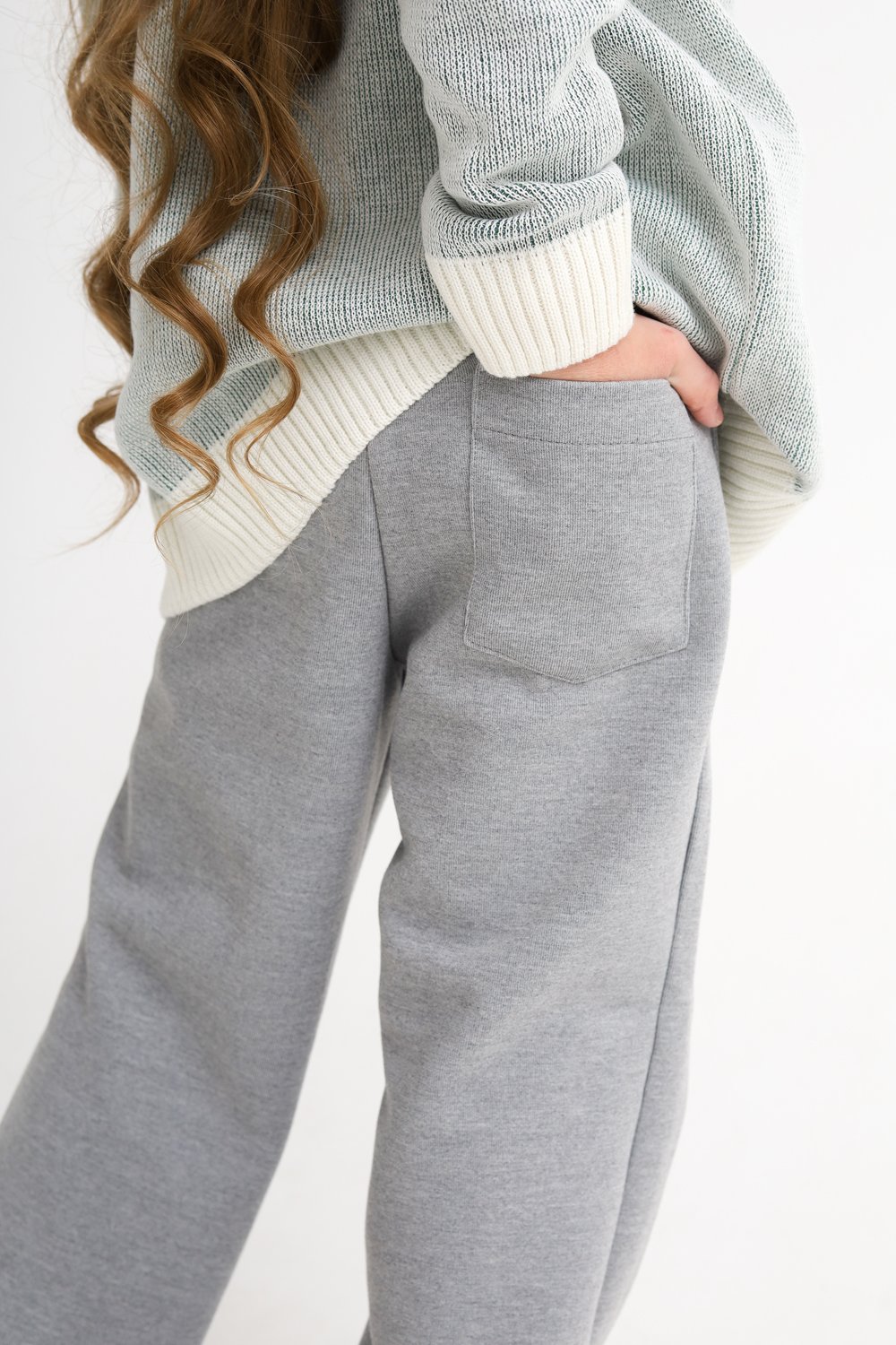 Брюки-трубы. Пояс на резинке со шнуром. Низ - вподгибку на плоскошовке. На задней правой части брюк - накладной карман