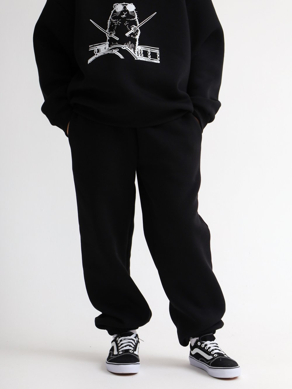 Объемные брюки из футера с начесом, с поясом на резинке со шнурком. Манжеты на резинке по низу, в боковых швах карманы.