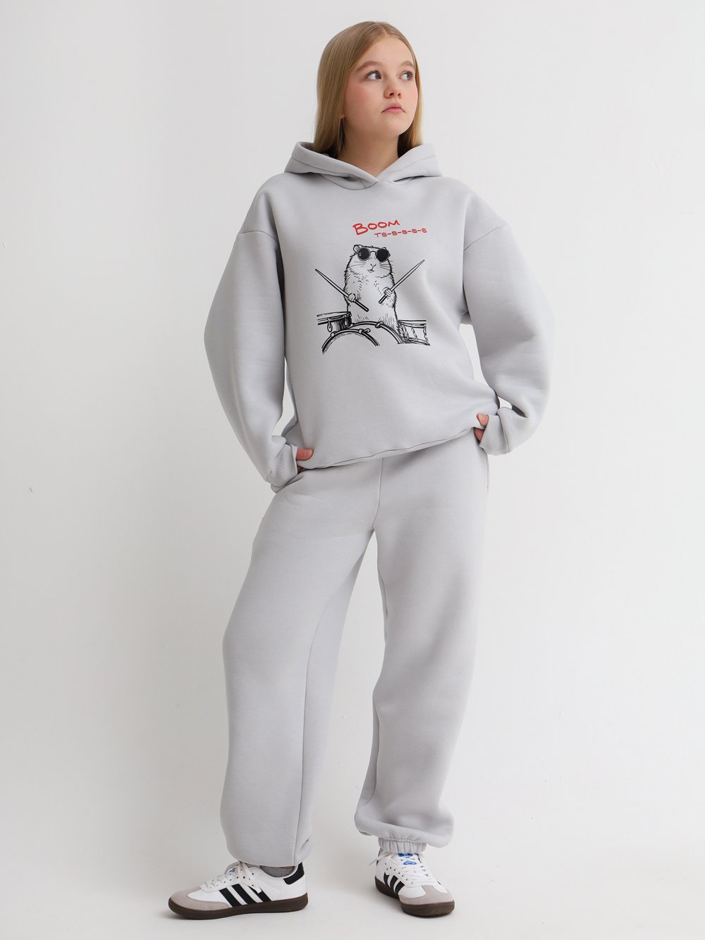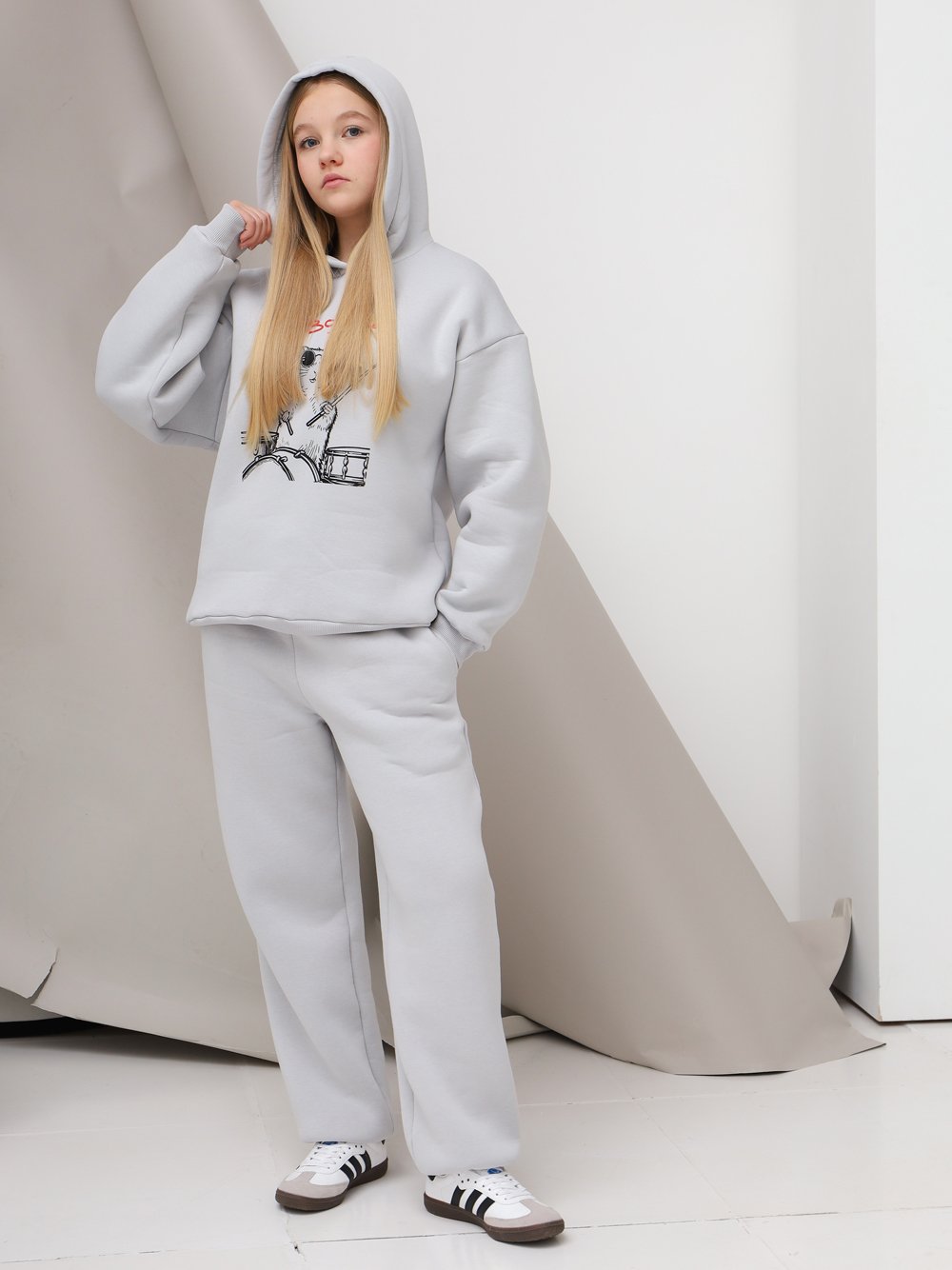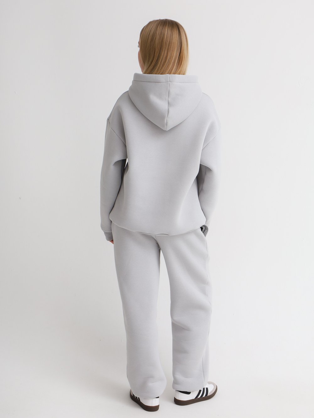 Объемные брюки из футера с начесом, с поясом на резинке со шнурком. Манжеты на резинке по низу, в боковых швах карманы.