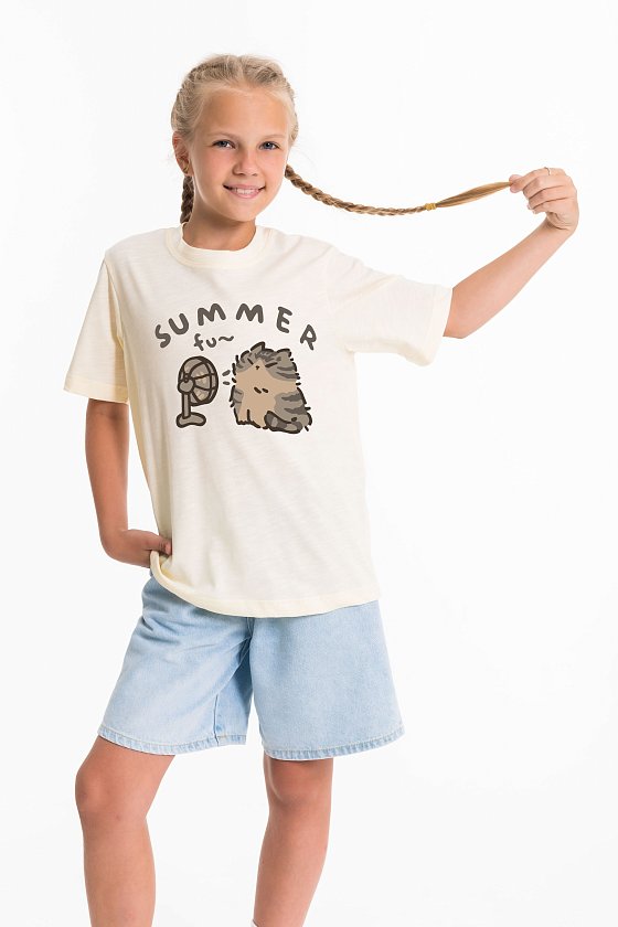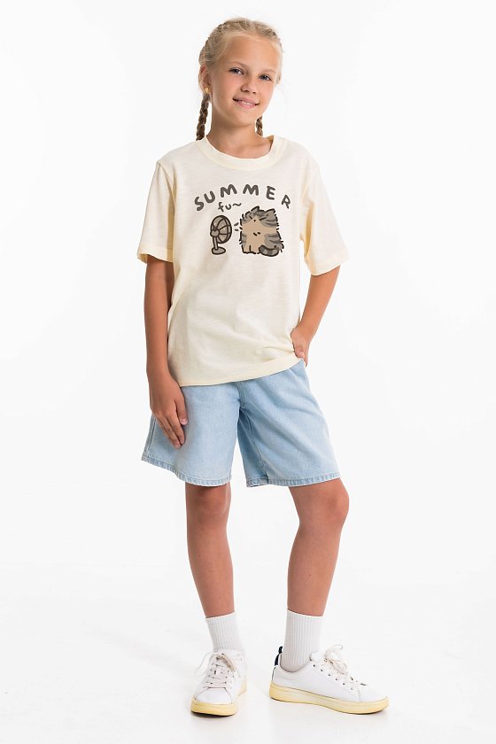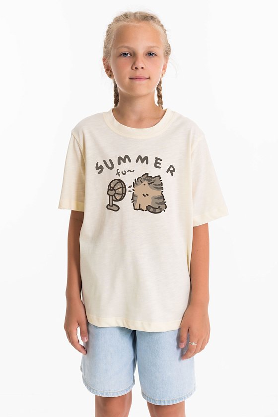 Детская футболка с принтом изготовлена из хлопкового полотна - кулирка "фламли", что обеспечивает комфорт и хорошую воздухопроницаемость. Футболка имеет короткий рукав и круглый вырез горловины, что придает ей классический стильный вид. Такая модель футболки отлично сочетается с джинсами, брюками или юбкой. Изготовленная из натуральной ткани, футболка обеспечит комфорт в течение всего дня.