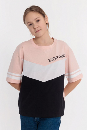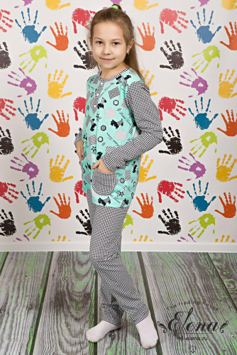 Пижама для девочек, выполнена из 100% хлопковой ткани. Футболка с длинным рукавом, спереди с карманами и планкой, имитирующей застёжку на пуговицы. Брюки прямого покроя на резине по поясу..