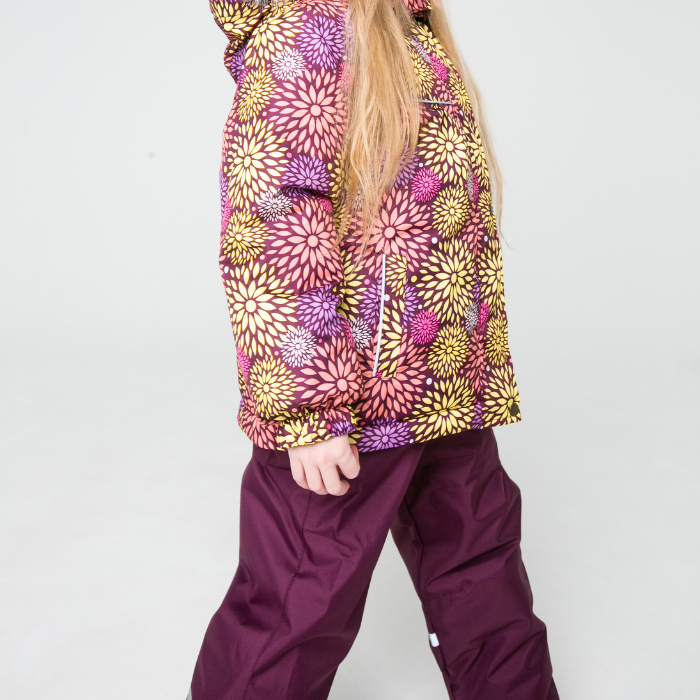 Дополняет образ, практичный непромокаемый полукомбинезон из усиленной ткани OXFORD, темно-фиолетового цвета. Защиту от морозного ветра, дождя или мокрого снега, обеспечит ветро-водостойкая мембранная ткань детского комплекта.