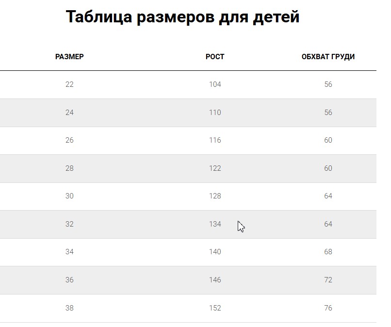 размерная сетка дети