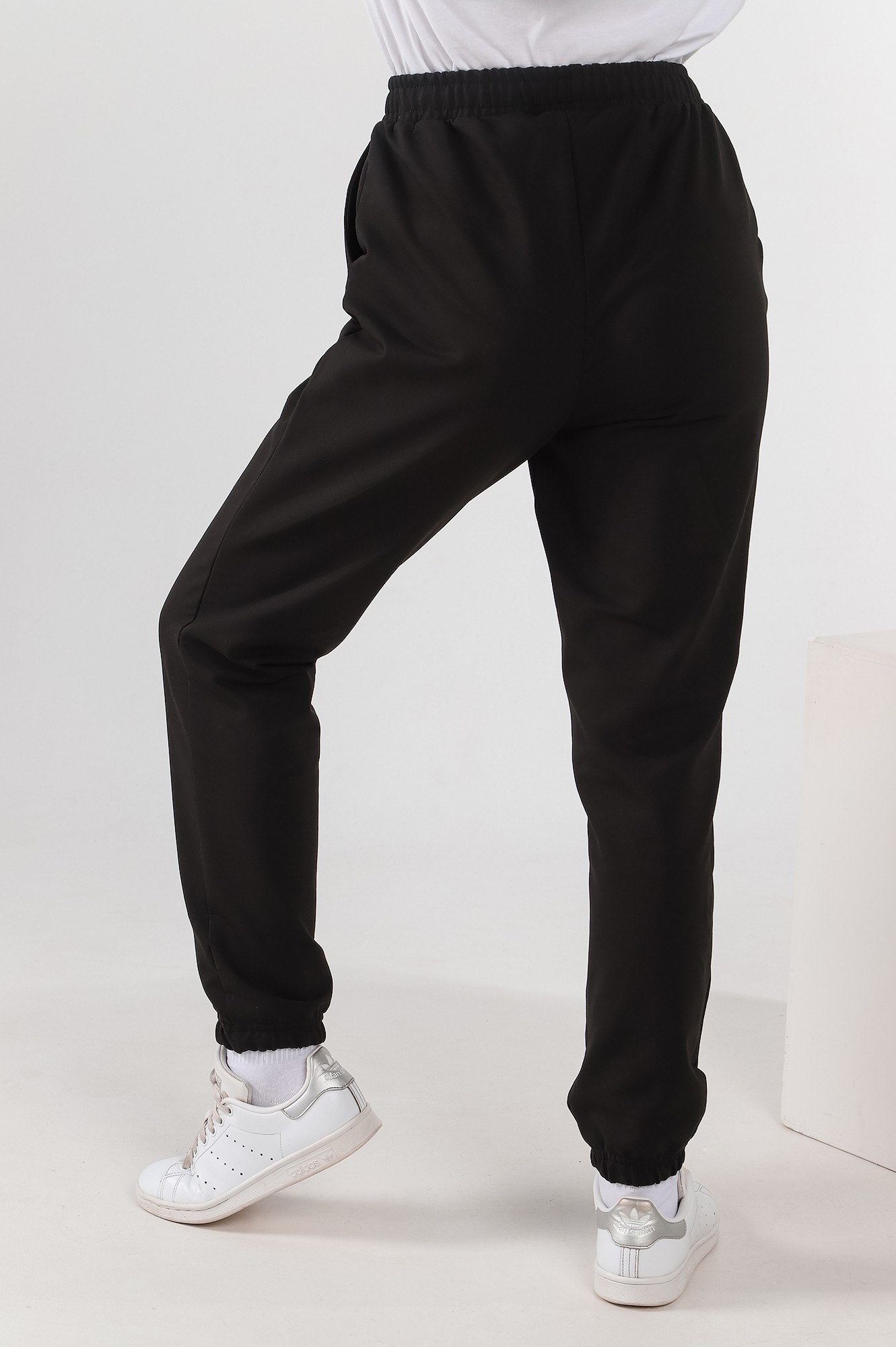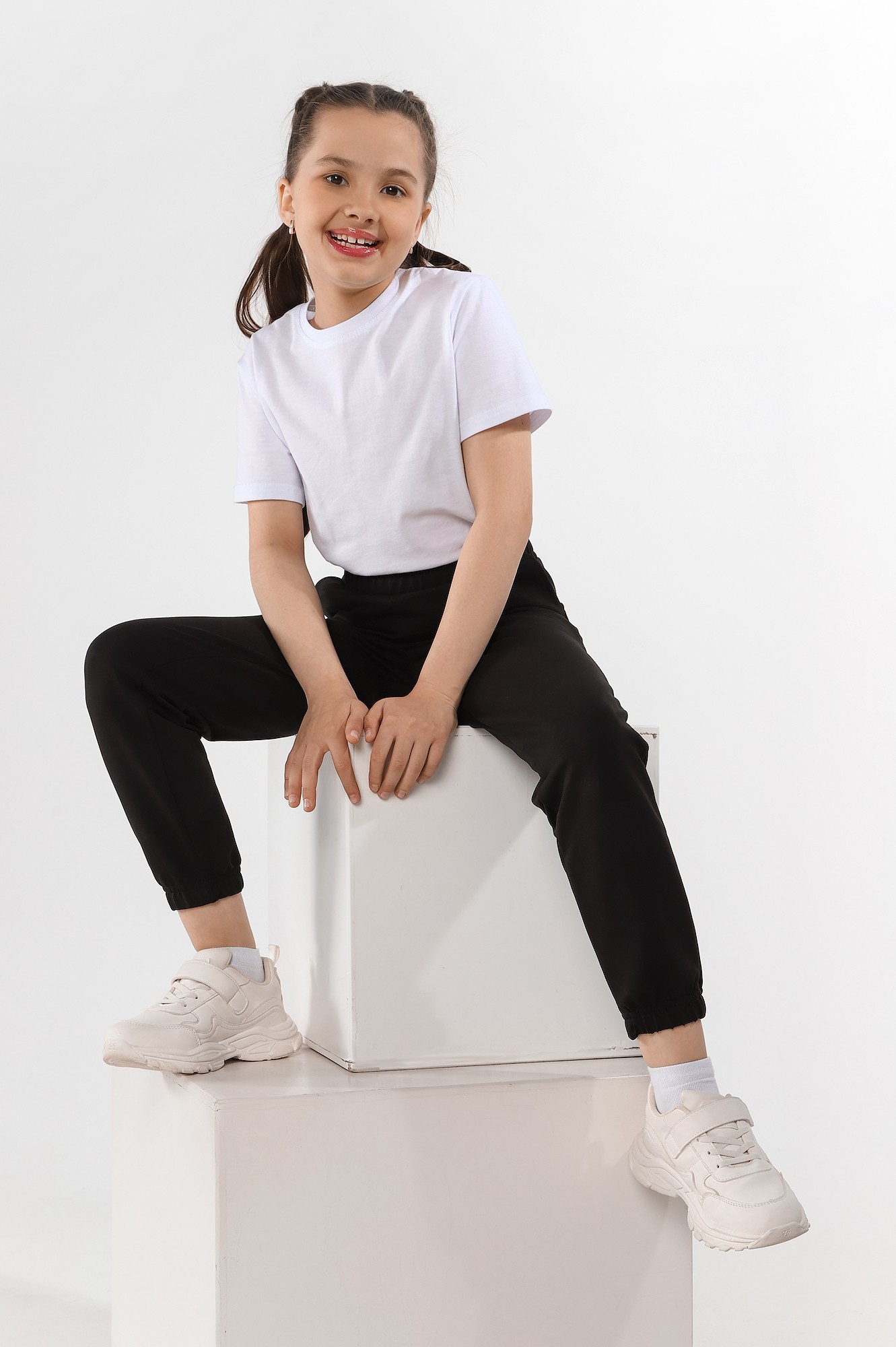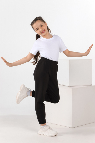 Базовые брюки из футера с лайкрой для девочки. Модель с боковыми карманами, на притачном поясе с отстроченной эластичной тесьмой и внутренним шнуром для регулировки плотности посадки на талии. Низ брючин с эластичной тесьмой.