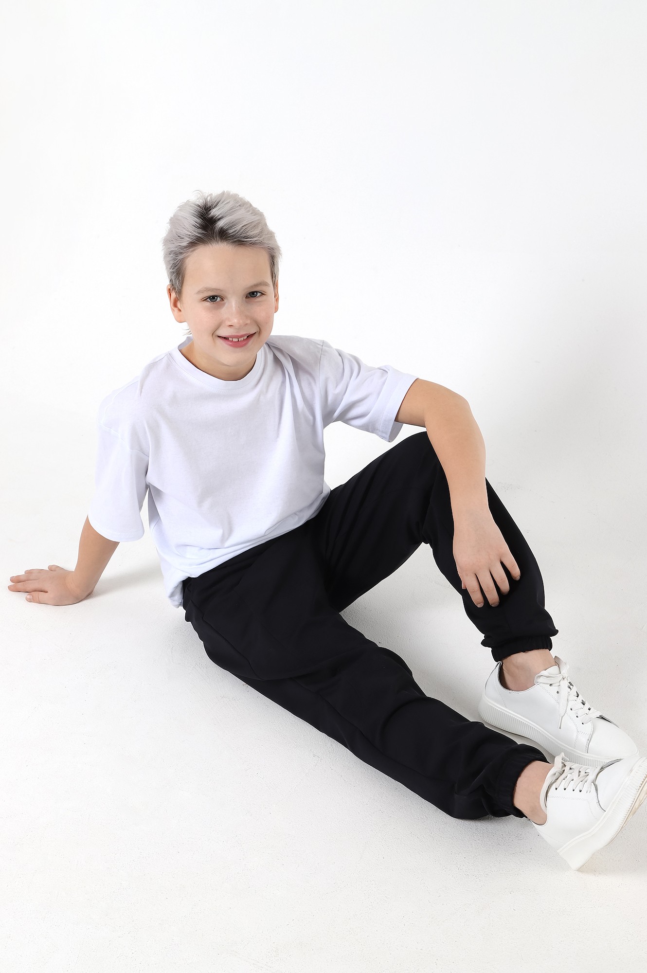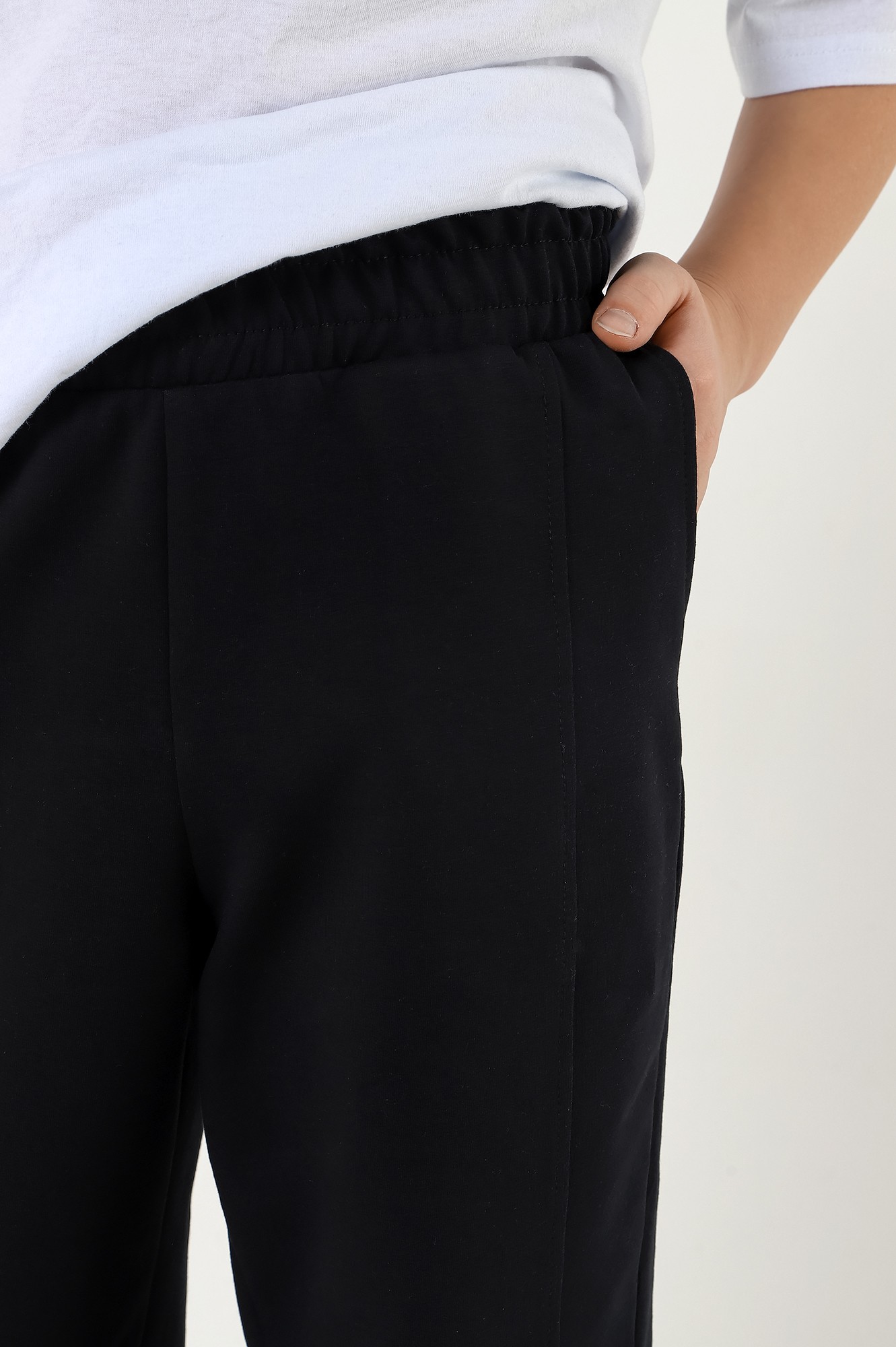 Брюки для мальчика изгладкокрашеного полотна "футер-двухнитка", на притачном поясе с эластичной тесьмой внутри и карманами в боковых швах. Средние половинки - из двух частей каждая, с отделочными строчками по швам стачивания. Нижние срезы обработаны подгибкой сэластичной тесьмой.