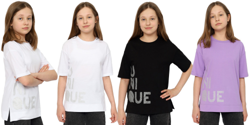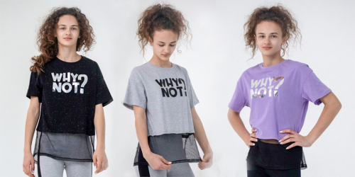 Кулирная гладь "НОПЕ", 97% хлопок, 3% полиэстер / Футболка для девочки свободного силуэта со спущенным плечом, короткими рукавами и отделкой из сетки. Горловина круглая, обработана воротником из полотна с эластаном. Перед футболки декорирован принтом с использованием красок с блеском. 1