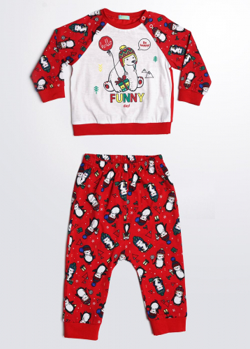 Комфортный в эксплуатации комплект из экологичного хлопка.По низу брюк,джемпера и рукавов -удобные манжеты.Горловина с застежкой на кнопки.Новогодняя тематика в принтах подарит отличное настроение