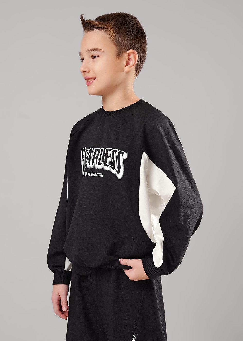 Трендовый свитшот из футера для подростка. Комфортная посадка, эластичная горловина. Модель дополнена фигурными контрастными вставками. Спереди стильный принт. Сочетай свитшот с брюками из новой коллекции и создавай крутые образы!