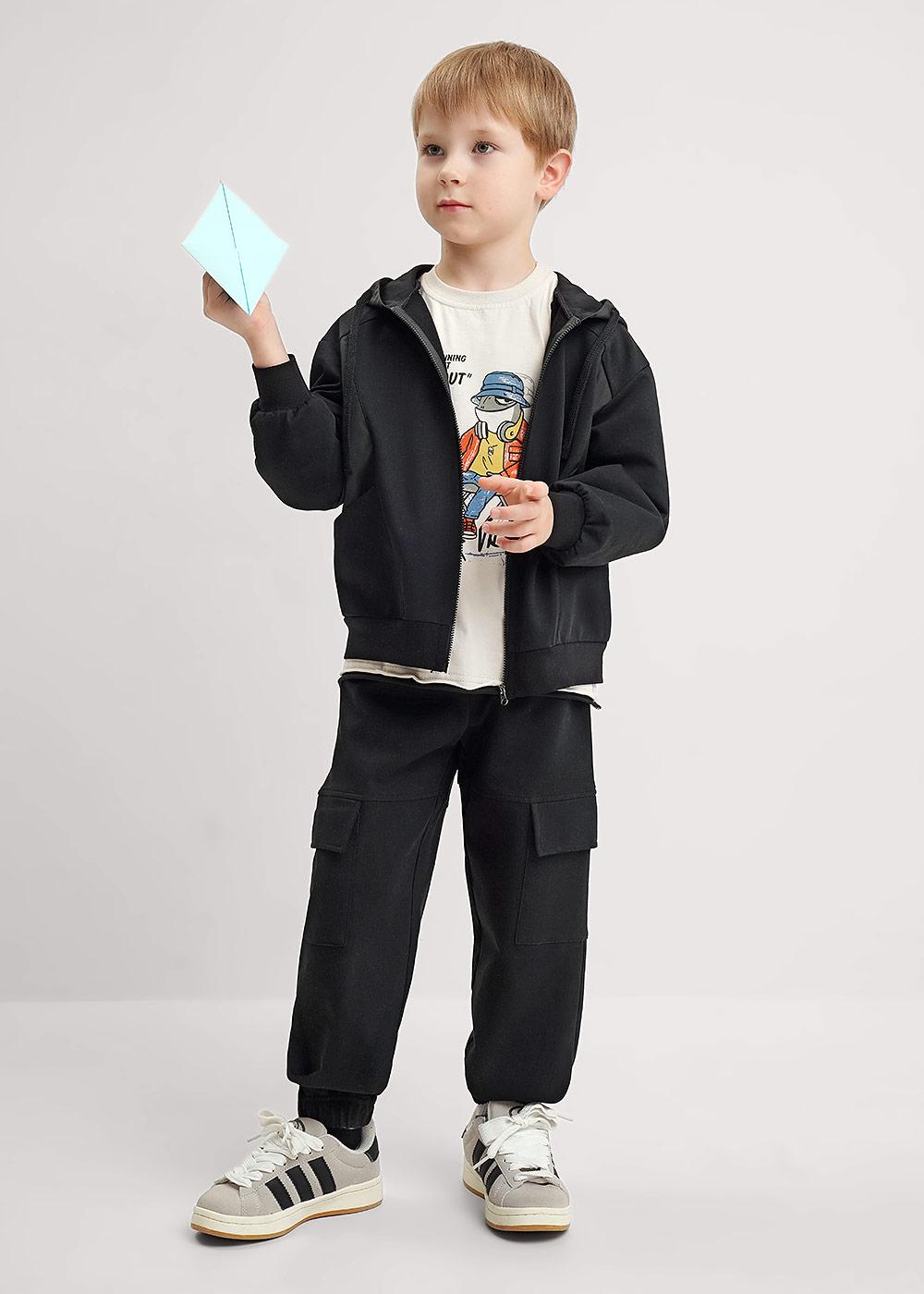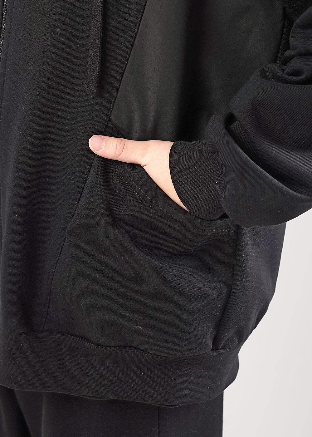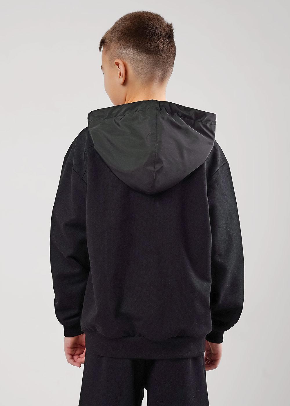 Удобная черная толстовка для мальчика с молнией, капюшон и боковые части из ветрозащитной плащевой ткани. Капюшон регулируется шнурком, есть вместительные карманы. Эластичные манжеты обеспечивают комфортную посадку по фигуре.