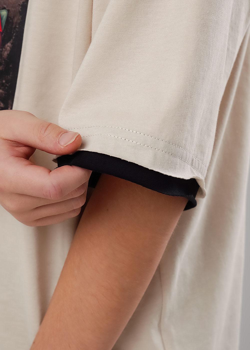 Стильная футболка оверсайз из 100% хлопка для мальчика с эластичной горловиной обеспечивает комфорт. Оригинальный принт на передней части привлекает внимание. Характерной деталью модели являются необработанные двойные края по низу изделия и рукавам.